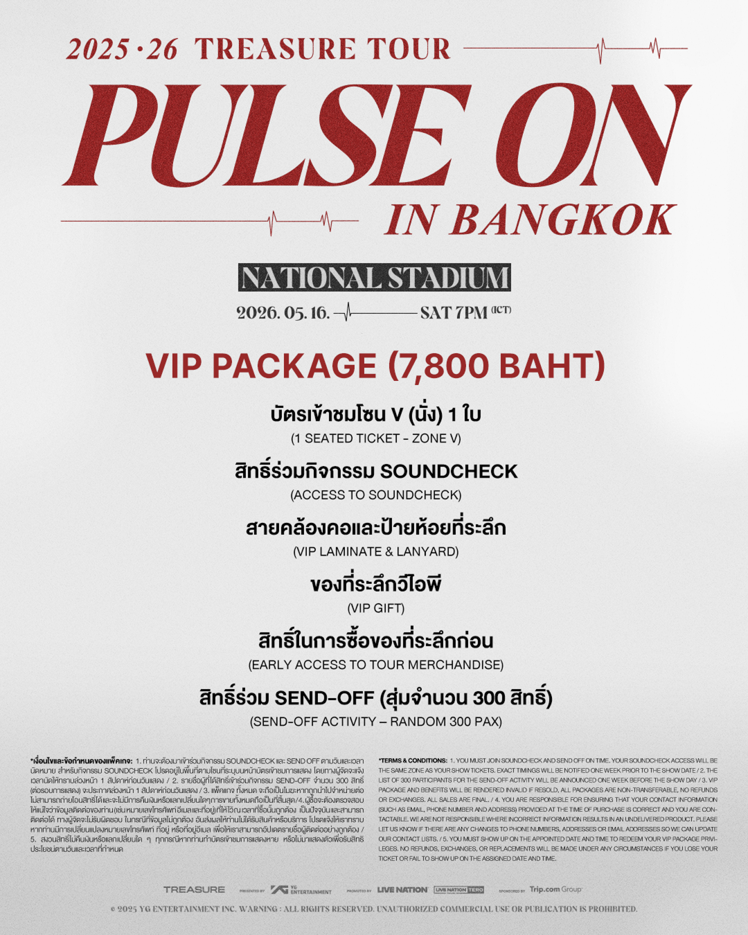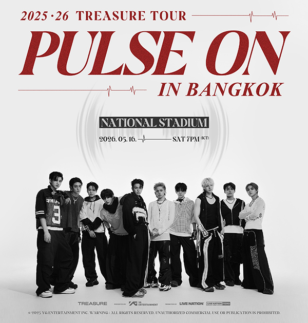 TREASURE เตรียมนำความสนุก ความมันส์ สุดขั้วมาเสิร์ฟทึเมไทยถึงที่ กับคอนเสิร์ตครั้งใหญ่ “2025-26 TREASURE TOUR [PULSE ON] IN BANGKOK” ที่สนามกีฬาแห่งชาติ (ศุภชลาศัย) วันเสาร์ที่ 16 พฤษภาคม 2569 ทึเมไทยเตรียมตัวกดบัตรรอบพรีเซลส์ได้ตั้งแต่ 27 พฤศจิกายนนี้เป็นต้นไป รายละเอียดเพิ่มเติมที่ livenationtero.co.th