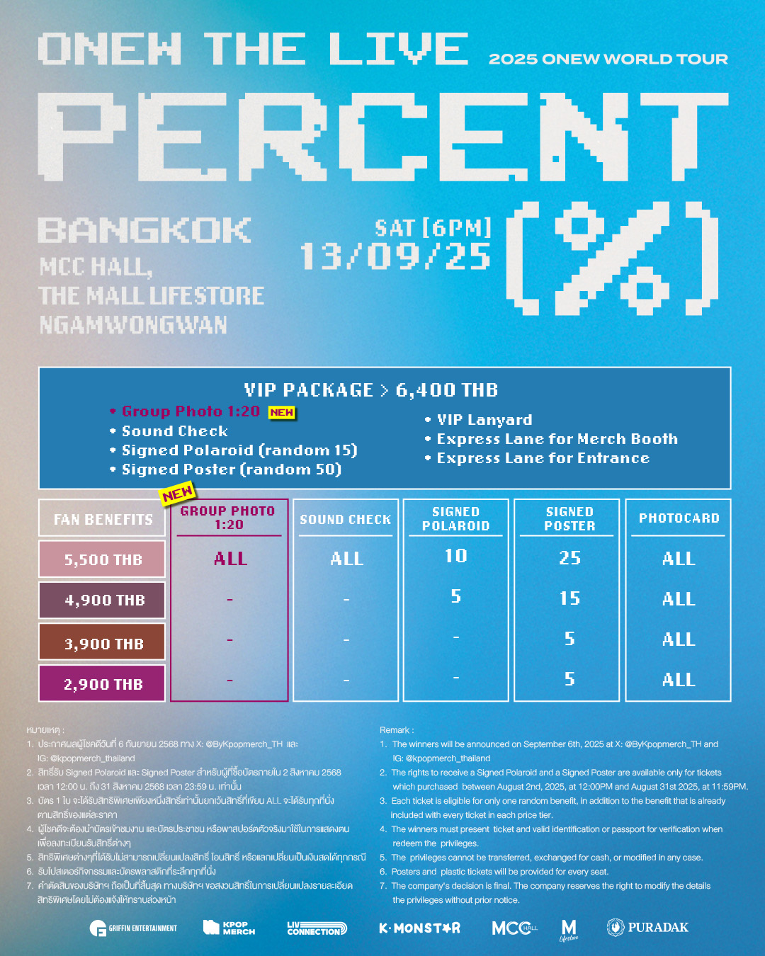 | ชื่องานแสดง : | 2025 ONEW WORLD TOUR [ONEW THE LIVE : PERCENT (%)] IN BANGKOK |