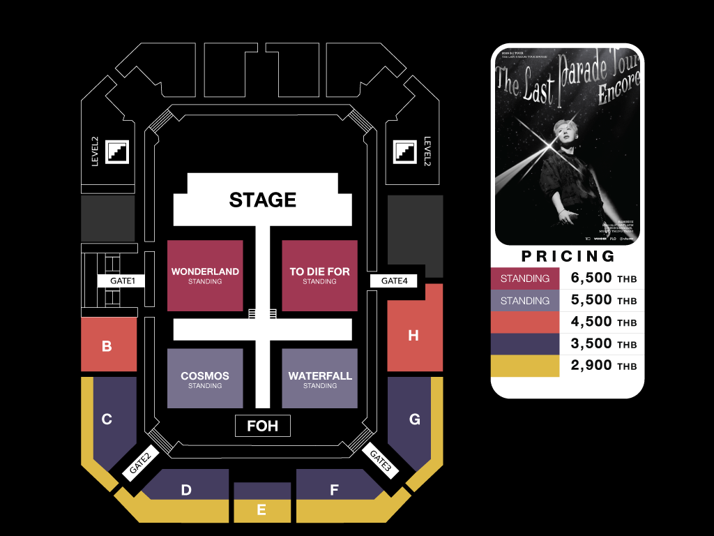 - โซนบัตรยืนจะมีการรันคิวเข้าฮอลล์ และจะเรียงตามลำดับการชำระเงินสำเร็จ