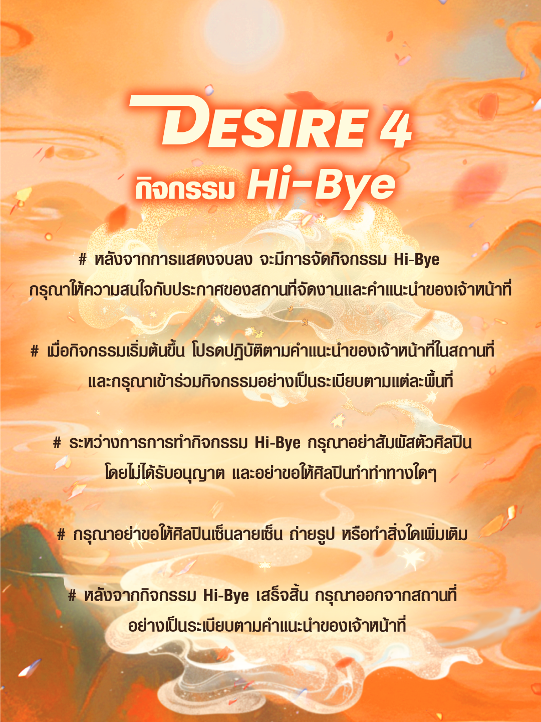 - ห้ามบันทึกภาพนิ่ง, วิดีโอ, เสียง และไลฟ์สด (ถ่ายทอดสด) ตลอดการชมงาน ไม่ว่าจะเป็นโทรศัพท์มือถือ, กล้องถ่ายรูป, กล้องวิดีโอ, แท็บเล็ต และอุปกรณ์บันทึกภาพและเสียงอื่นๆ