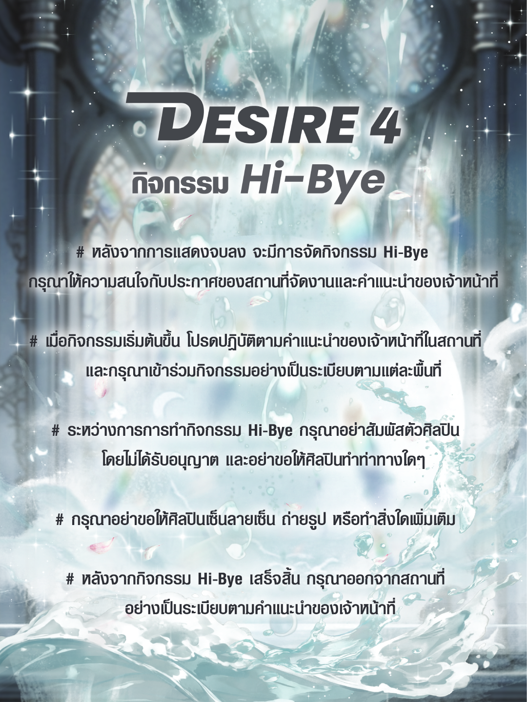 - ห้ามบันทึกภาพนิ่ง, วิดีโอ, เสียง และไลฟ์สด (ถ่ายทอดสด) ตลอดการชมงาน ไม่ว่าจะเป็นโทรศัพท์มือถือ, กล้องถ่ายรูป, กล้องวิดีโอ, แท็บเล็ต และอุปกรณ์บันทึกภาพและเสียงอื่นๆ
