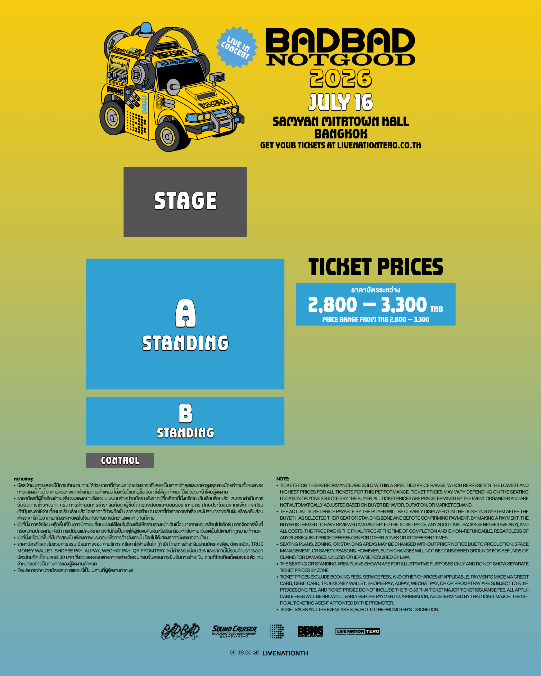 • ราคาบัตรที่แสดงไม่รวมค่าธรรมเนียมการจอง ค่าบริการ หรือค่าใช้จ่ายอื่นใด (ถ้ามี) ซึ่งจะแสดงแยกต่างหากอย่างชัดเจนก่อนขั้นตอนการยืนยันการชำระเงิน ตามที่ไทยทิคเก็ตเมเจอร์ ตัวแทนจำหน่ายอย่างเป็นทางการของผู้จัดงานกำหนด