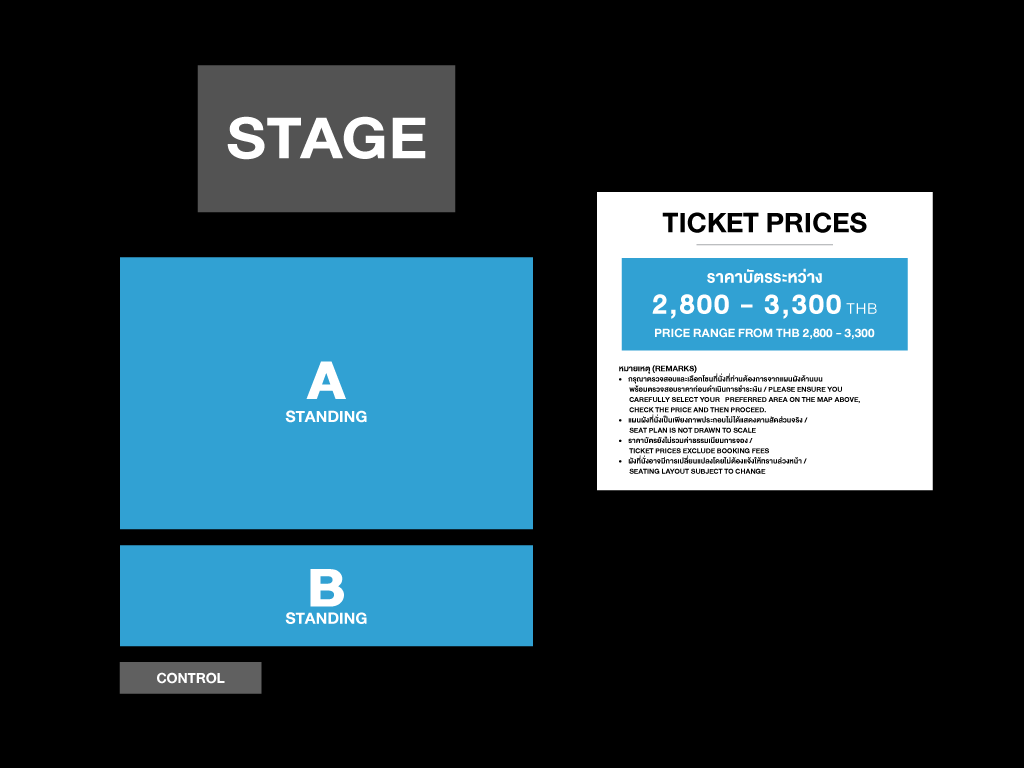 • ผังที่นั่งหรือผังพื้นที่ยืนที่แสดงเป็นเพียงภาพประกอบเพื่อการอ้างอิงเท่านั้น โดยไม่ได้แสดงราคาบัตรแยกตามโซน