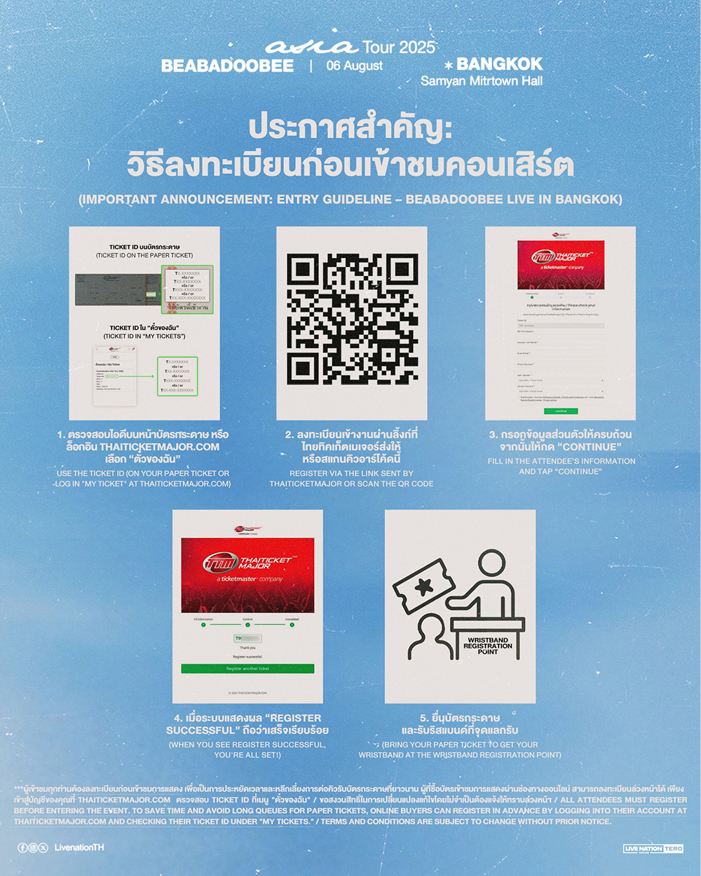 • เพื่อเป็นการเตรียมความพร้อมสำหรับการเปิดจำหน่ายบัตร แนะนำให้ลูกค้าลงทะเบียนกับไทยทิคเก็ตเมเจอร์ที่เป็นตัวแทนจำหน่ายอย่างเป็นทางการ ทางเว็บไซต์