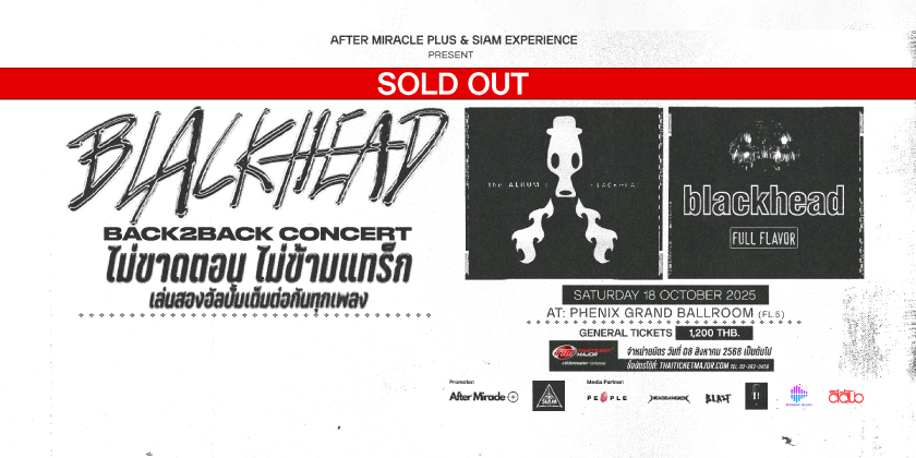 เตรียมพบกับปรากฏการณ์ทางดนตรีครั้งสำคัญ Blackhead หนึ่งในวงร็อกที่ทรงอิทธิพลที่สุดของวงการเพลงไทย เตรียมกลับมาสร้างความประทับใจอีกครั้งในคอนเสิร์ต “After Miracle Plus & Siam Experience present BLACKHEAD: BACK2BACK CONCERT” นี่ไม่ใช่แค่คอนเสิร์ตธรรมดา แต่คือการพาแฟนๆ เดินทางย้อนเวลาสู่จุดเริ่มต้นของความยิ่งใหญ่ของวง กับการแสดงสดครบทุกเพลงแบบไม่ขาดตอน ไม่ข้ามแทร็ก จาก 2 อัลบั้มระดับตำนาน The Album – Blackhead และ Full Flavor ที่เรียกได้ว่าเป็นสัญลักษณ์ของวง และลายเซ็นทางดนตรีของแบล็กเฮด