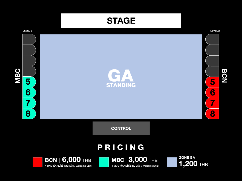 • บัตรราคา: 1,200 บาท (บัตรยืน) / Balcony ราคา 6,000 บาท สำหรับ 4 ท่าน / Mini Balcony ราคา 3,000 บาท สำหรับ 2 ท่าน