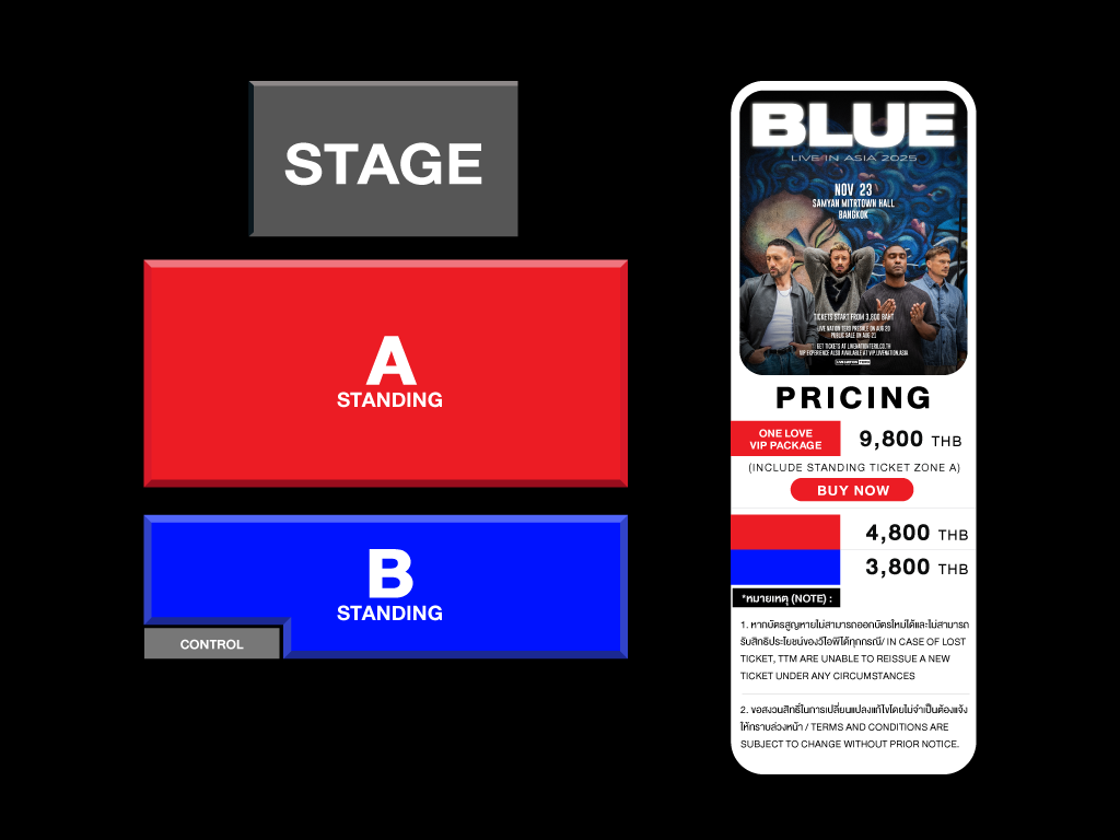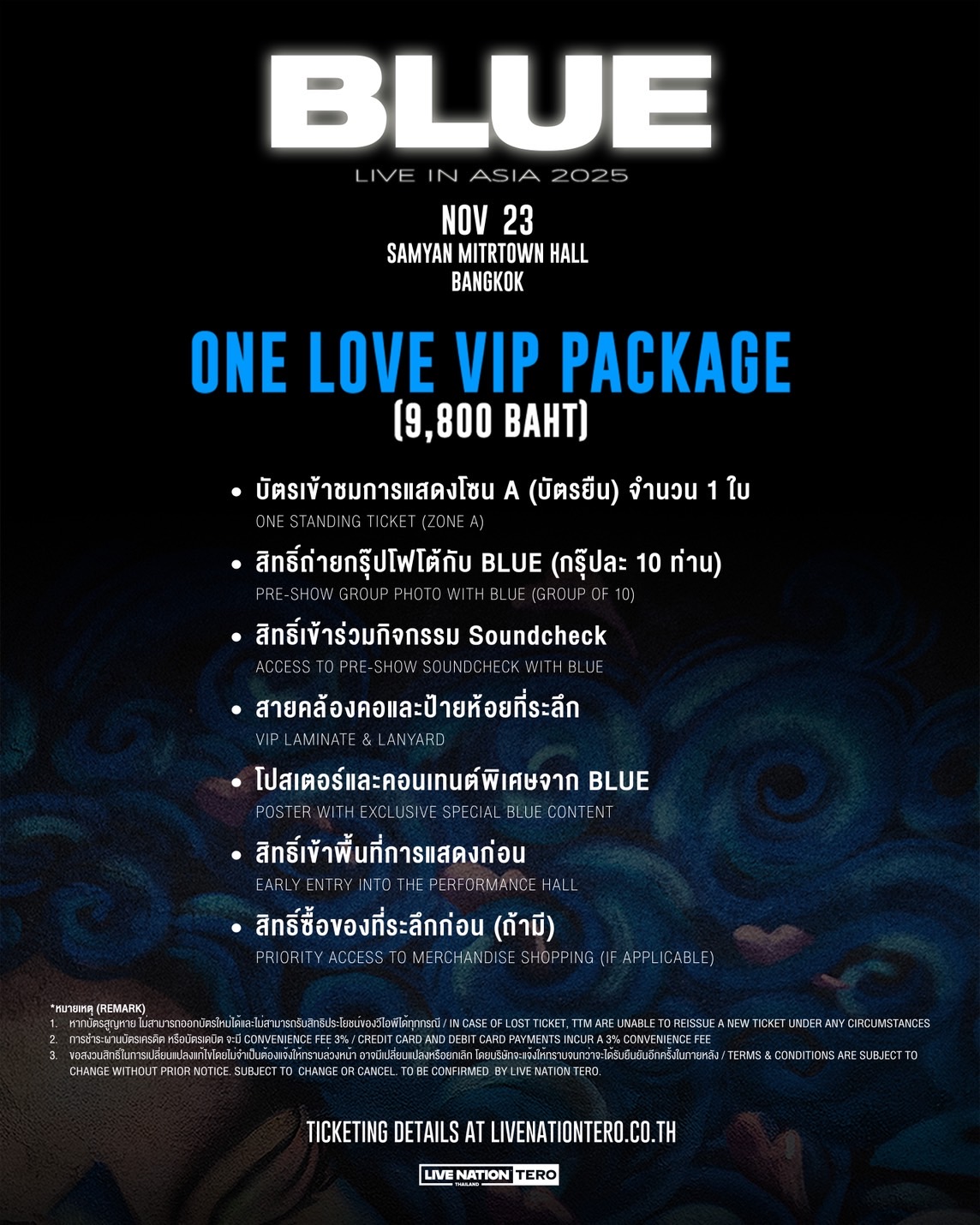 พิเศษสุด ๆ สำหรับแฟนพันธุ์แท้ BLUE ซื้อวีไอพีแพคเกจเพื่อรับสิทธิพิเศษกว่าใคร ติดตามรายละเอียดเพิ่มเติมได้ทาง https://vip.livenation.asia/