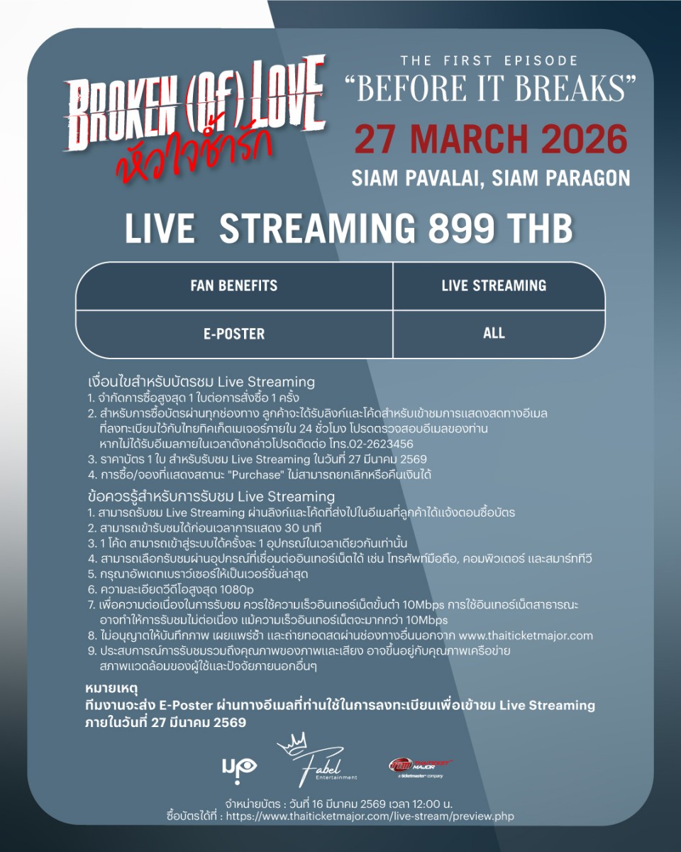 2. สำหรับการซื้อบัตรผ่านทุกช่องทาง ลูกค้าจะได้รับลิงก์และโค้ดสำหรับเข้าชมการแสดงสดทางอีเมลที่ลงทะเบียนไว้กับไทยทิคเก็ตเมเจอร์ภายใน 24 ชั่วโมง โปรดตรวจสอบอีเมลของท่าน หากไม่ได้รับอีเมลภายในเวลาดังกล่าวโปรดติดต่อ โทร.02-2623456