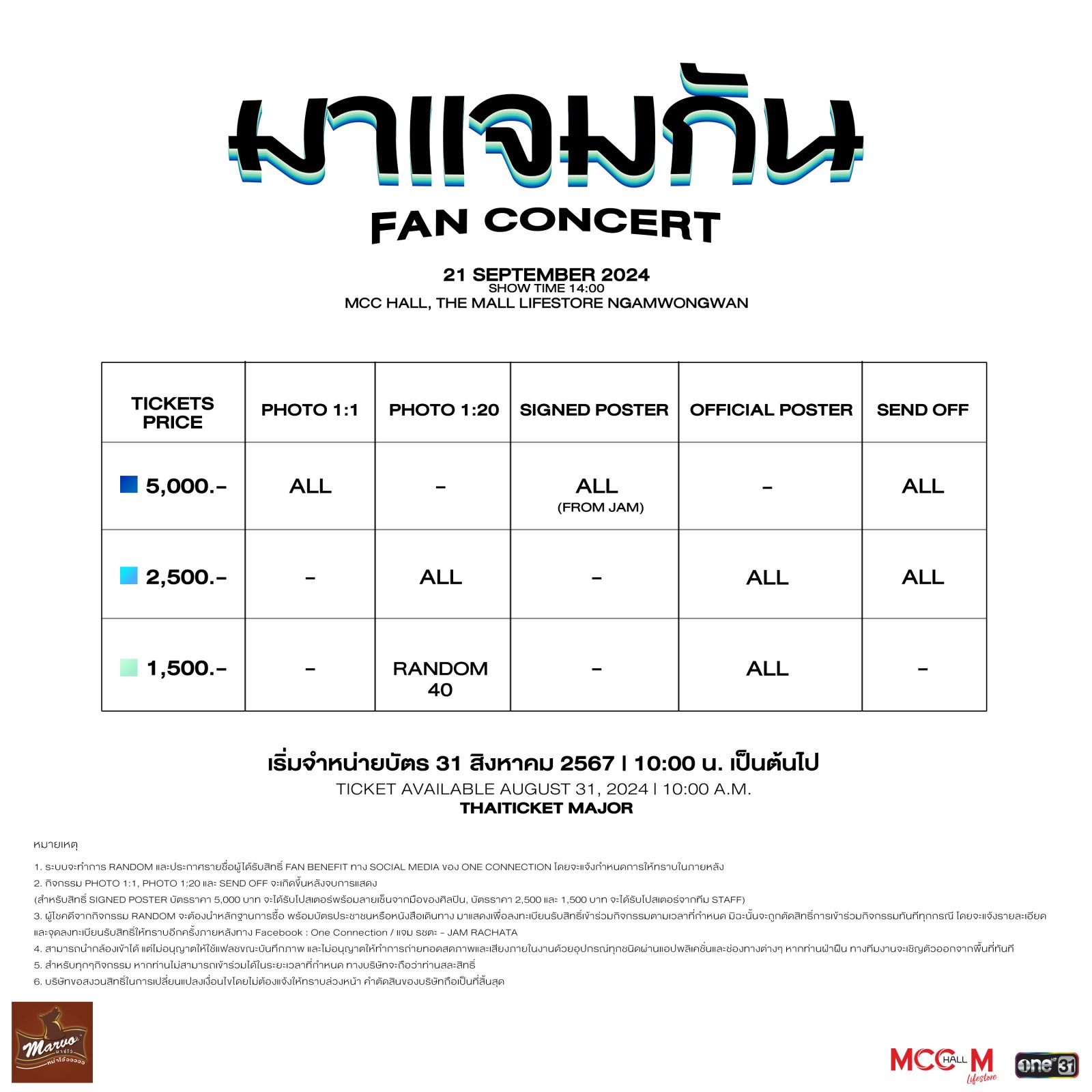 - เปิดจำหน่ายบัตร วันเสาร์ที่ 31 สิงหาคม 2567 เวลา 10.00 น. เป็นต้นไป
