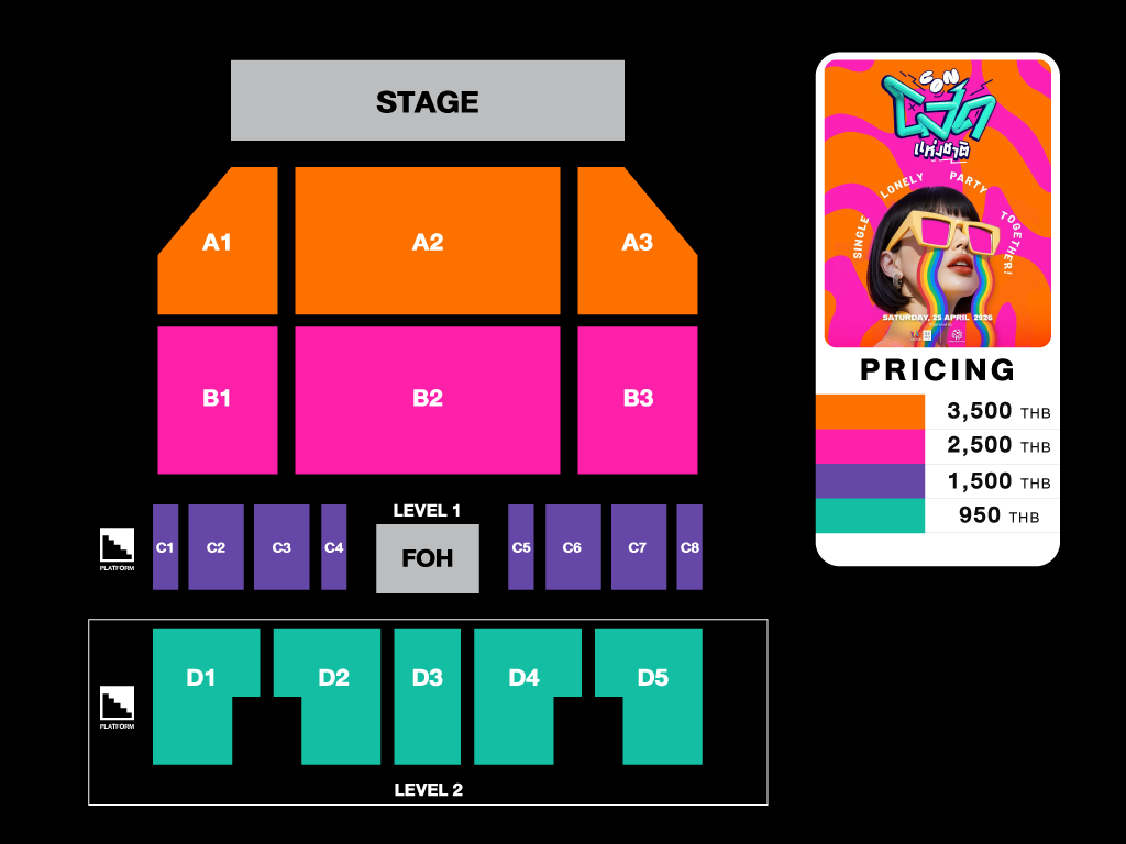 3,000 / 2,000 / 1,000 บาท *เปิดจำหน่ายเฉพาะ โซน A B และ C **รับส่วนลดพิเศษสำหรับราคาบัตร 3,500 / 2,500 / 1,500 บาท ที่นั่งละ 500 บาท |