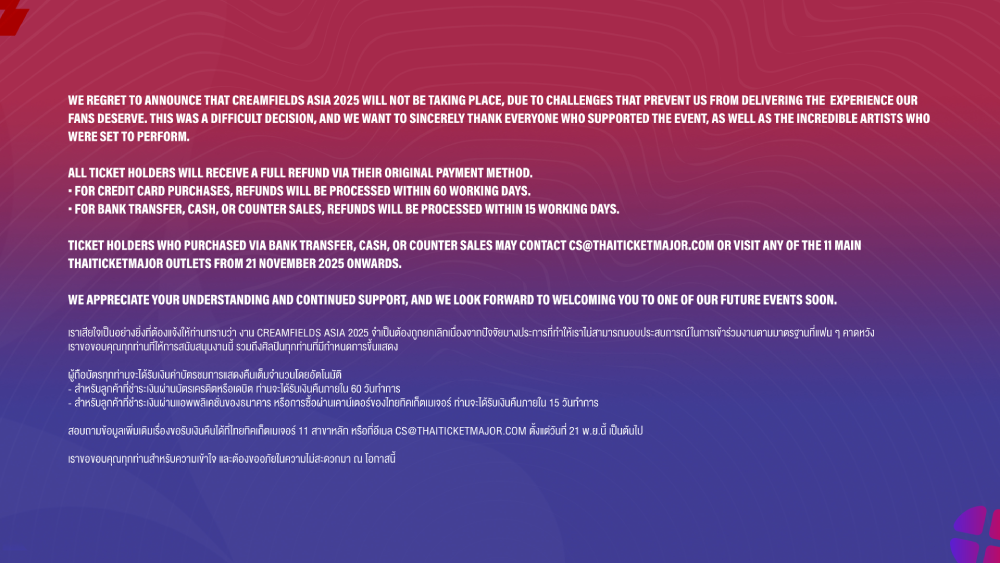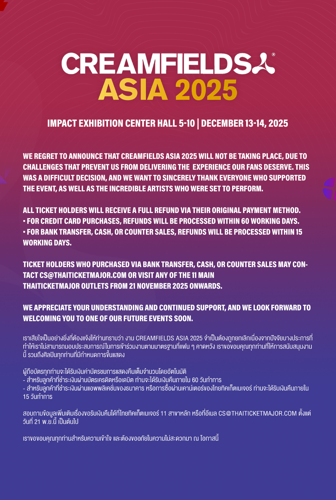 · กรุณาตรวจสอบรายละเอียดรอบการแสดง เวลาประตูเปิด และกำหนดการที่เว็บไซต์ www.creamfieldsasia.com หรือโซเชียลมีเดียอย่างเป็นทางการของงาน หรือ Download Application Creamfields Asia ได้ทาง IOS และ Android