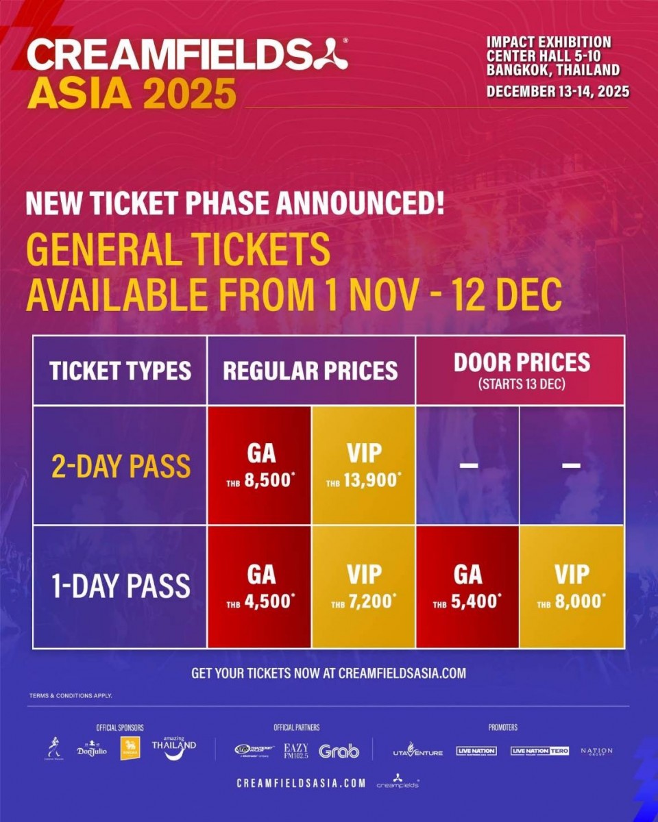 และเว็บไซต์ CreamfieldsAsia.com หรือ Download Application Creamfields Asia ได้ทาง IOS และ Android