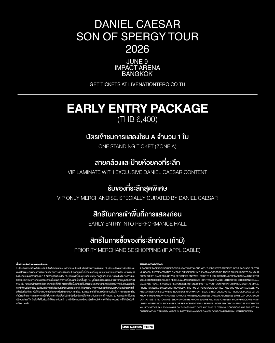 แฟนชาวไทยเตรียมตัวสัมผัสความอบอุ่นละมุนใจกับผลงานชุดใหม่ในเวอร์ชั่นความเป็นพ่อของแดเนียล ซีซาร์ได้ ในคอนเสิร์ต Daniel Caesar - Son of Spergy Tour ที่กรุงเทพฯ ในเดือนมิถุนายนนี้ บัตรราคาเริ่มต้น 1,900 บาท สมาชิก Live Nation Tero รับสิทธิ์ซื้อบัตรก่อนใคร 21 เมษายนนี้ (10.00 – 23.59 น.) ทาง