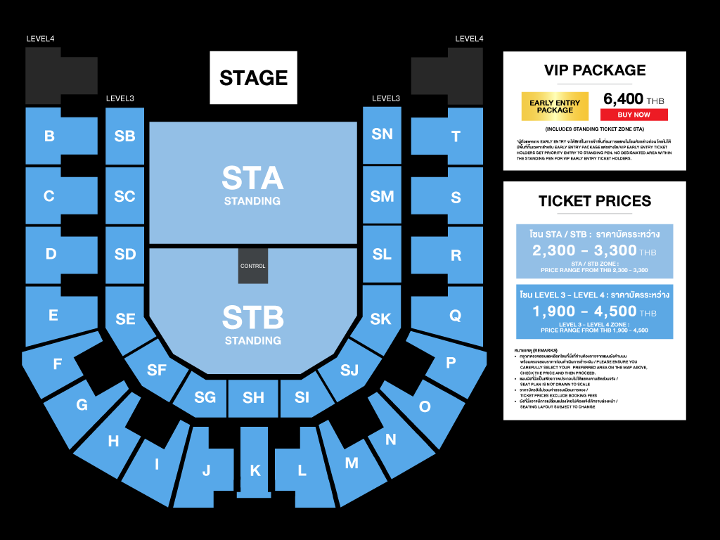 ผังที่นั่งหรือผังพื้นที่ยืนที่แสดงเป็นเพียงภาพประกอบเพื่อการอ้างอิงเท่านั้น โดยไม่ได้แสดงราคาบัตรแยกตามโซน