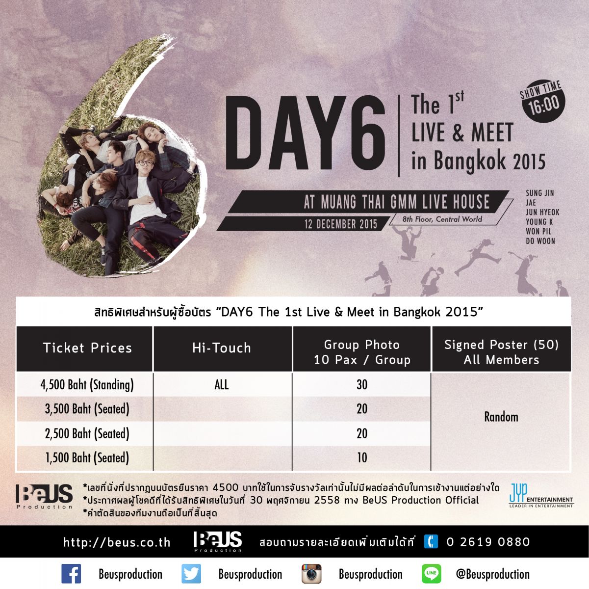 BeUS Production คว้าตัว ’DAY6’ 6 หนุ่มมิวสิคแบนด์วงแรกของ JYP Entertainment ผู้มาพร้อมความสามารถทางดนตรีที่ล้นหลาม บินตรงมาจัด Fan Meeting ในรูปแบบใหม่ครั้งแรก ที่จะผนวกความมันส์จากการแสดงดนตรีสดในแบบ Live Show และความสนุกสนานอบอุ่นแบบ Fan Meeting ให้แฟนๆชาวไทยได้ชมกันเป็นครั้งแรกที่ประเทศไทยในงาน “DAY6 The 1st Live & Meet in Bangkok 2015”