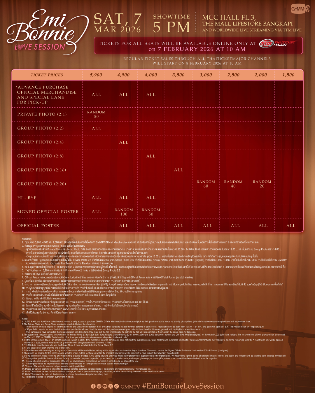 3. ระบบจะทำการ Random และประกาศรายชื่อผู้ได้รับ Private Photo 2:1 สำหรับบัตร 5,900 บาท, Group Photo 2:20 สำหรับบัตร 3,000 / 2,500 / 2,000 บาท, OFFICIAL POSTER (Signed) สำหรับบัตร 4,900 / 4,000 บาท ในวันที่ 2 มีนาคม 2569 ทางโซเชียลมีเดียของ GMMTV (สงวนสิทธิ์บัตรที่นั่งหนึ่งใบ สามารถรับ Fan Benefit จากการ Random ได้เพียง 1 สิทธิ์เท่านั้น)