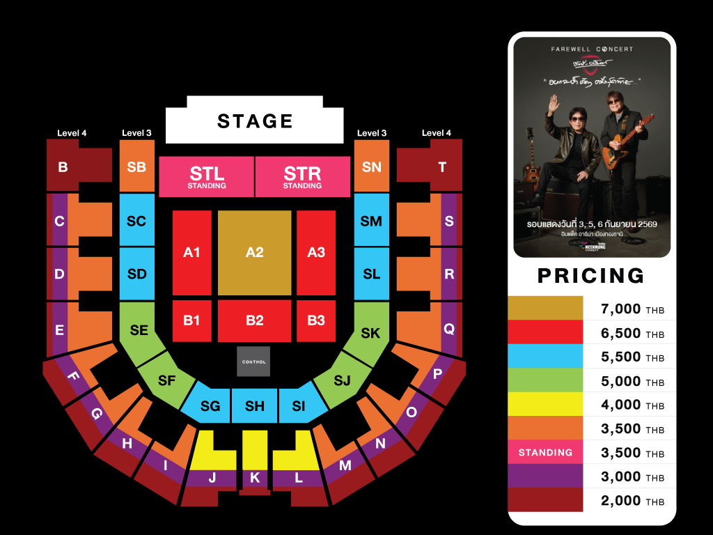 ราคาบัตร: 2,000 / 3,000 / 3,500 / 3,500 (บัตรยืน) / 4,000 / 5,000 / 5,500 / 6,500 และ 7,000 บาท