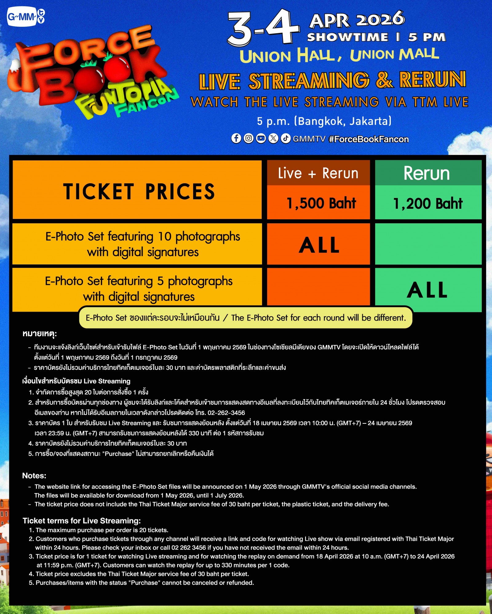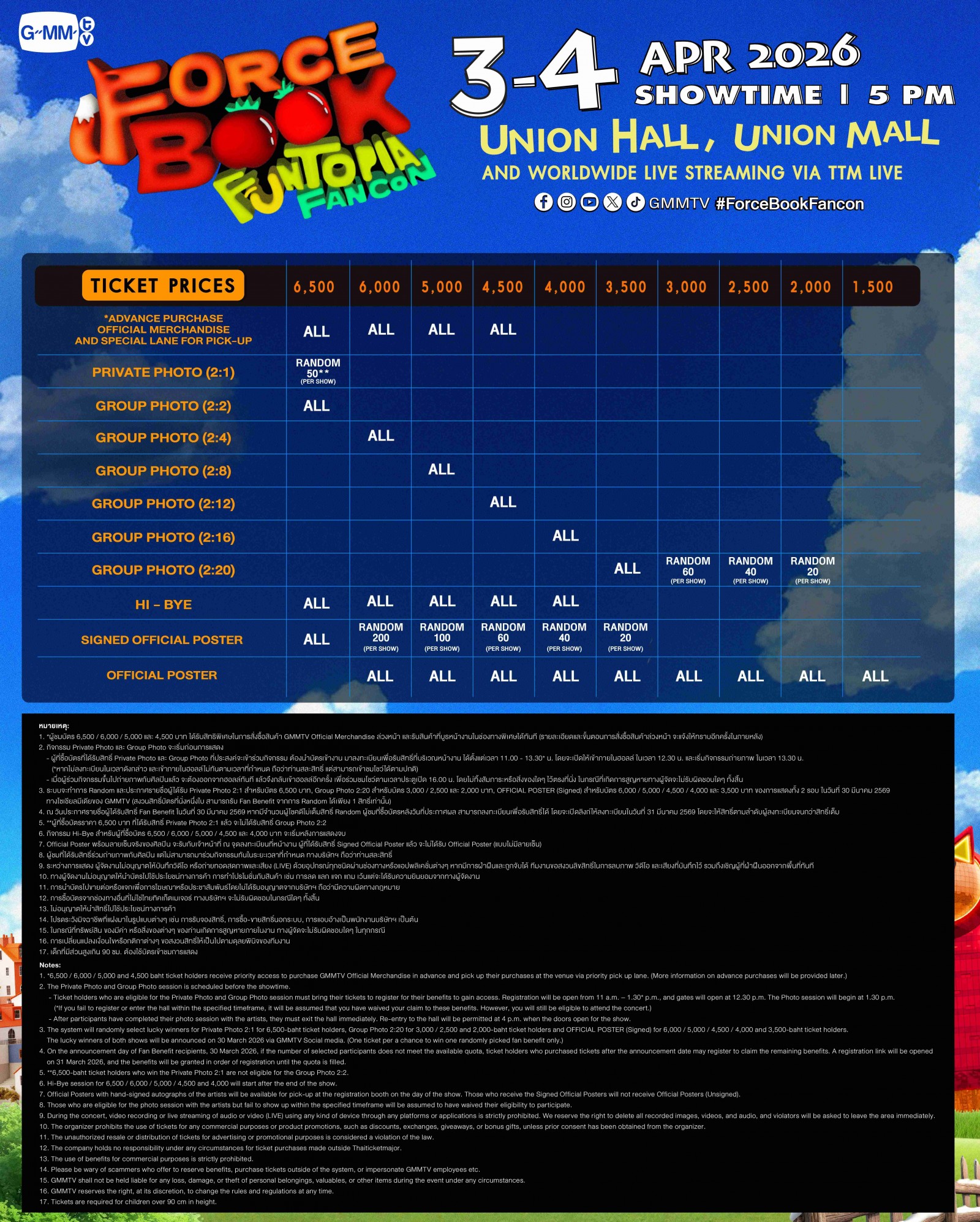 3.ระบบจะทำการ Random และประกาศรายชื่อผู้ได้รับ Private Photo 2:1 สำหรับบัตร 6,500 บาท, Group Photo 2:20 สำหรับบัตร 3,000 / 2,500 และ 2,000 บาท, OFFICIAL POSTER (Signed) สำหรับบัตร 6,000 / 5,000 / 4,500 / 4,000 และ 3,500 บาท ของทั้ง 2 รอบการแสดง ในวันที่ 30 มีนาคม 2569 ทางโซเชียลมีเดียของ GMMTV (สงวนสิทธิ์บัตรที่นั่งหนึ่งใบ สามารถรับ Fan Benefit จากการ Random ได้เพียง 1 สิทธิ์เท่านั้น)