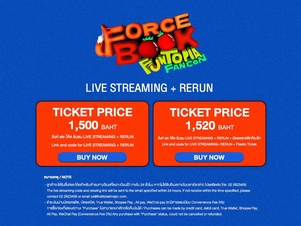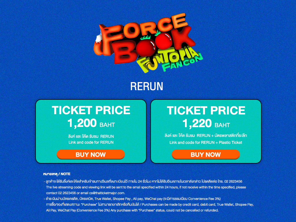 - ราคาบัตรยังไม่รวมค่าบริการไทยทิคเก็ตเมเจอร์ใบละ 30 บาท และค่าบัตรพลาสติกที่ระลึกและค่าขนส่ง