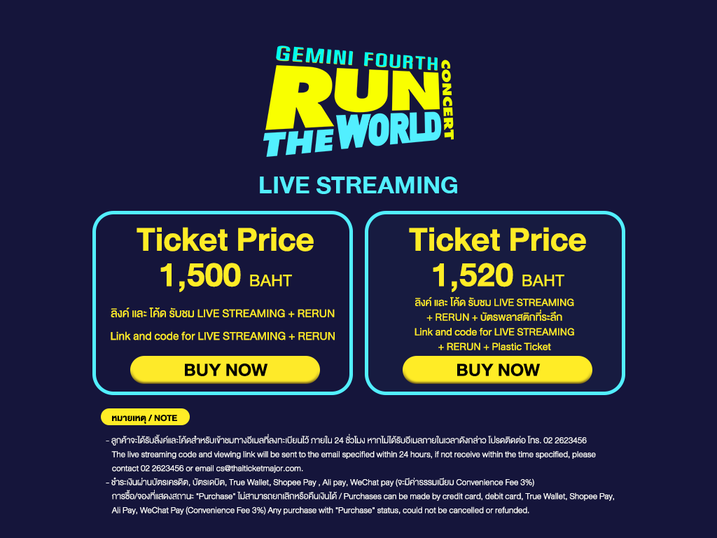 2. สำหรับการซื้อบัตรผ่านทุกช่องทาง ลูกค้าจะได้รับลิงก์และโค้ดสำหรับเข้าชมการแสดงสดทางอีเมลที่ลงทะเบียนไว้กับไทยทิคเก็ตเมเจอร์ภายใน 24 ชั่วโมง โปรดตรวจสอบอีเมลของท่าน หากไม่ได้รับอีเมลภายในเวลาดังกล่าวโปรดติดต่อ โทร. 022623456