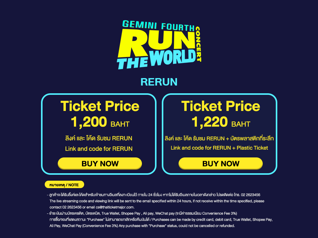 3. ราคาบัตร 1 ใบ สำหรับรับชม Live Streaming ในวันเสาร์ที่ 31 สิงหาคม 2567 เวลา 17.00 น. (GMT+7) หรือ วันอาทิตย์ที่ 1 กันยายน 2567 เวลา 17.00 น. (GMT+7) ตามรอบการแสดงที่เลือกซื้อ และ รับชมการแสดงย้อนหลัง ตั้งแต่วันศุกร์ที่ 13 กันยายน 2567 เวลา 10.00 น. (GMT+7) – วันพฤหัสที่ 19 กันยายน 2567 เวลา 23.59 น. (GMT+7) สามารถรับชมการแสดงย้อนหลังได้ 300 นาที ต่อ 1 รหัสการรับชม