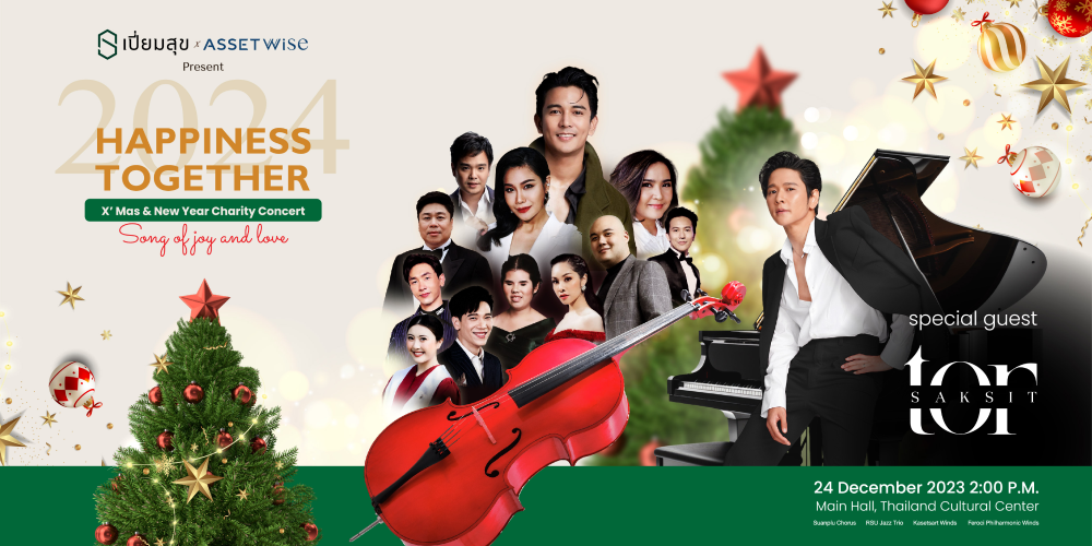 บริษัท เปี่ยมสุข พร็อพเพอร์ตี้ ดีเวลลอปเม้นท์ จำกัด ร่วมกับ บริษัท แอสเซทไวส์ จํากัด (มหาชน) ขอเชิญชวนทุกท่านมาร่วมอิ่มเอมใจในเทศกาลแห่งการเฉลิมฉลองคริสต์มาสและปีใหม่ ในคอนเสิร์ตการกุศล “Happiness Together 2024” – Song of joy and love ในวันอาทิตย์ที่ 24 ธันวาคม พ.ศ. 2566 ณ หอประชุมใหญ่ ศูนย์วัฒนธรรมแห่งประเทศไทย เริ่มเวลา 14.00 น.