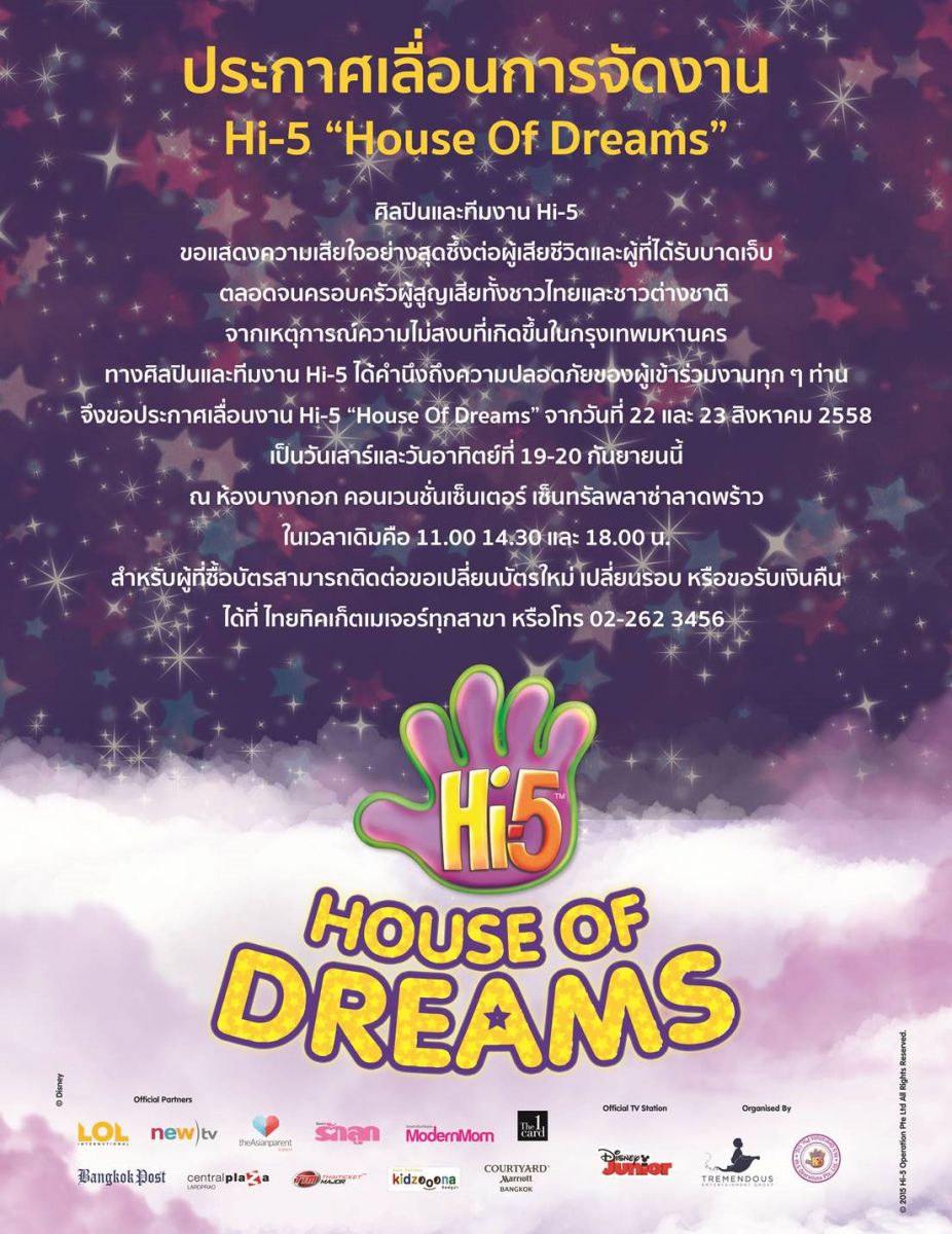 ใช้บัตรเดิมได้ โดยได้ที่นั่งเดิม เวลาเดิม เปลี่ยนแค่วัน จากเดิมวันเสาร์ที่ 22 สิงหาคม 2558 เปลี่ยนเป็น วันเสาร์ที่ 19 กันยายน 2558 เวลาแต่ละรอบ เหมือนเดิม และวันอาทิตย์ที่ 23 สิงหาคม 2558 เปลี่ยนเป็น วันอาทิตย์ที่ 20 กันยายน 2558 ในกรณีไม่สะดวก สามรถคืนบัตรได้ ตั้งแต่วันที่ 21 สิงหาคม 2558 เป็นต้นไป จนถึงวันที่ 31 สิงหาคม 2558 ![]() ความฝันกำลังจะกลับมา พร้อมโชว์รูปแบบใหม่จาก Hi-5 ‘Hi-5 House of Dreams’