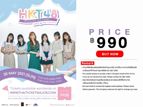 - รับชมการแสดงย้อนหลัง ผ่านทาง https://rerun.thaiticketmajor.com/hkt48letsgotohakata/ ตั้งแต่วันที่ 6 มิถุนายน 2564 - วันที่ 12 มิถุนายน 2564 สามารถรับชมการแสดงย้อนหลังได้ 240 นาที ต่อ 1 รหัสการรับชม