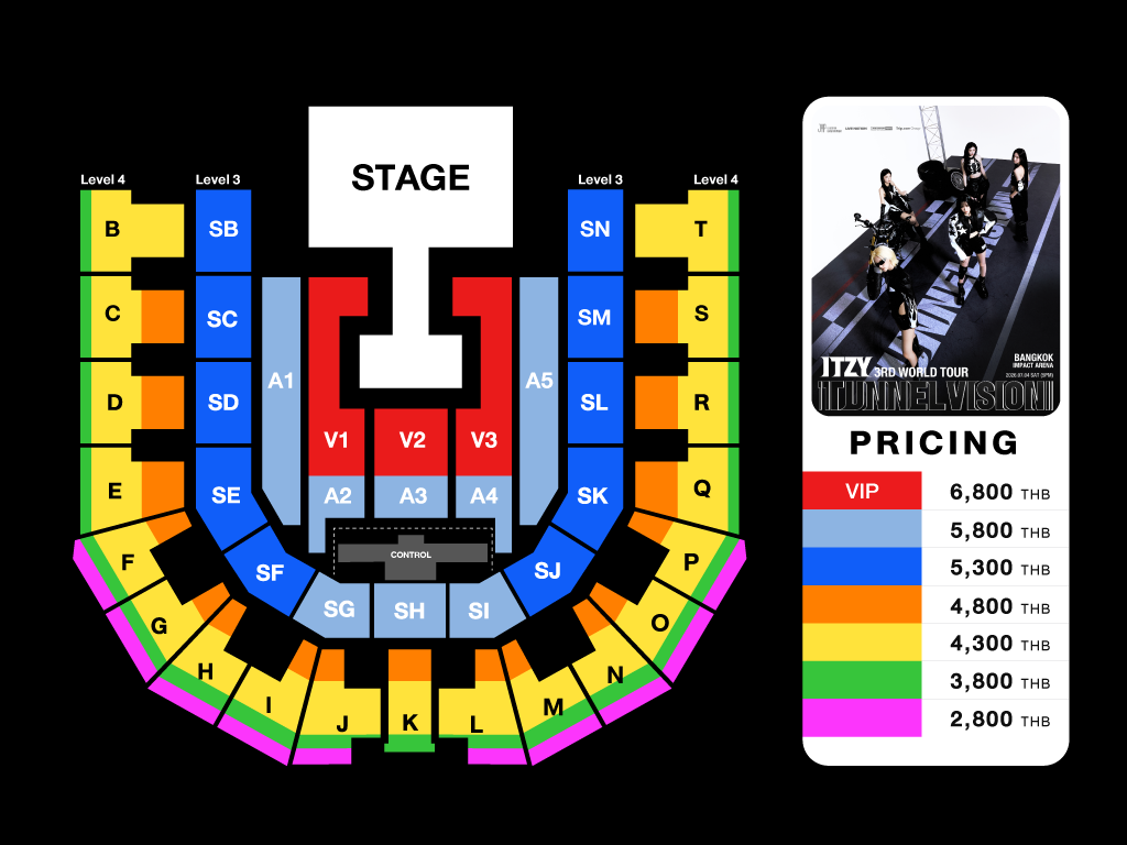 • บัตรเข้าชมการแสดงนี้มีการจำหน่ายภายใต้ช่วงราคาที่กำหนด โดยช่วงราคาที่แสดงเป็นราคาต่ำสุดและราคาสูงสุดของบัตรเข้าชมทั้งหมดสำหรับการแสดงนี้ ทั้งนี้ ราคาบัตรอาจแตกต่างกันตามตำแหน่งที่นั่งหรือโซนที่ผู้ซื้อเลือก ซึ่งได้ถูกกำหนดไว้แล้วล่วงหน้าโดยผู้จัดงาน