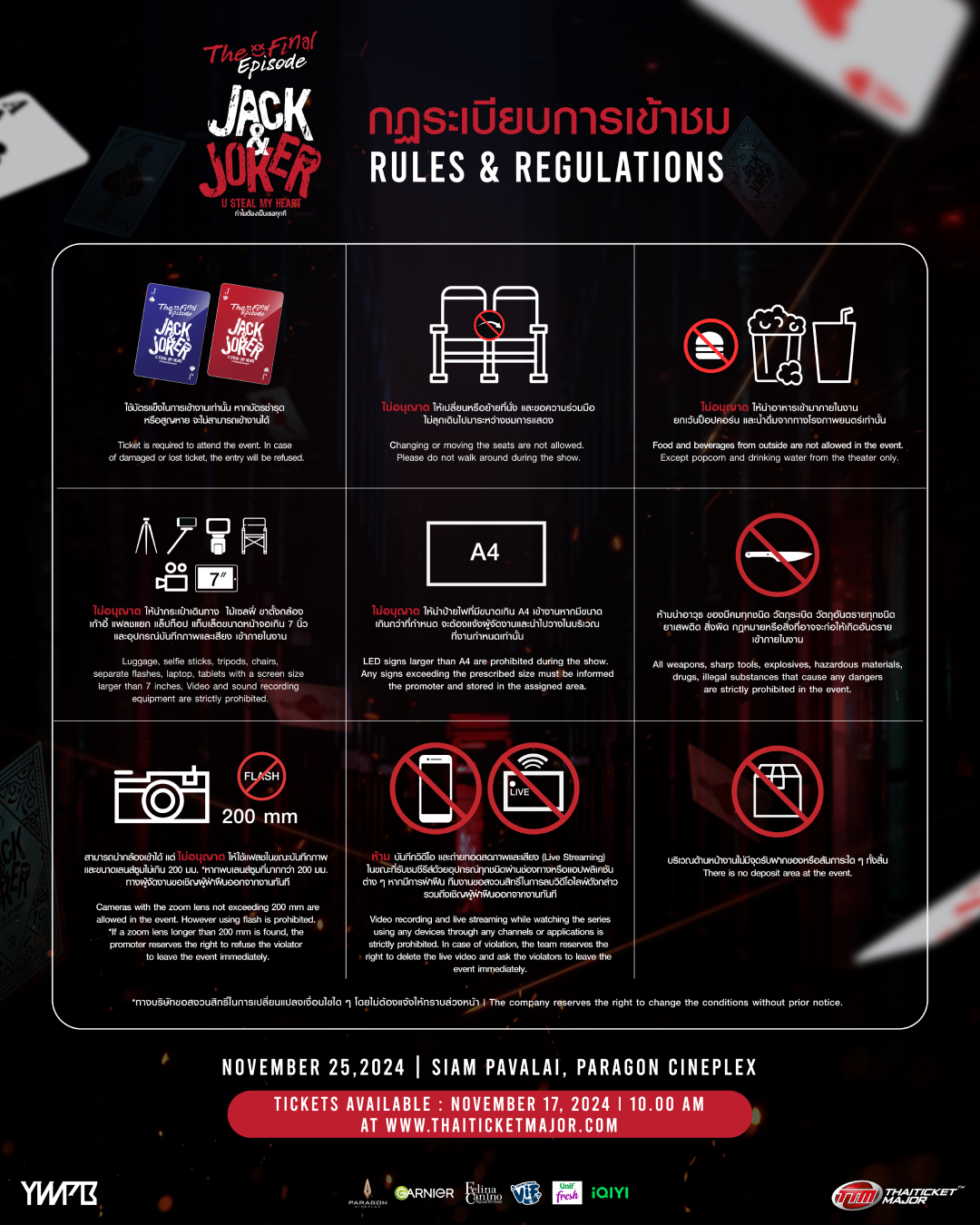 - ผู้จัดงานไม่อนุญาตให้บันทึกภาพวิดีโอหรือ Live ทางสื่อโซเชียลมีเดียโดยเด็ดขาด หากฝ่าฝืนทางทีมงานจะเชิญตัวออกจากพื้นที่ทันที
