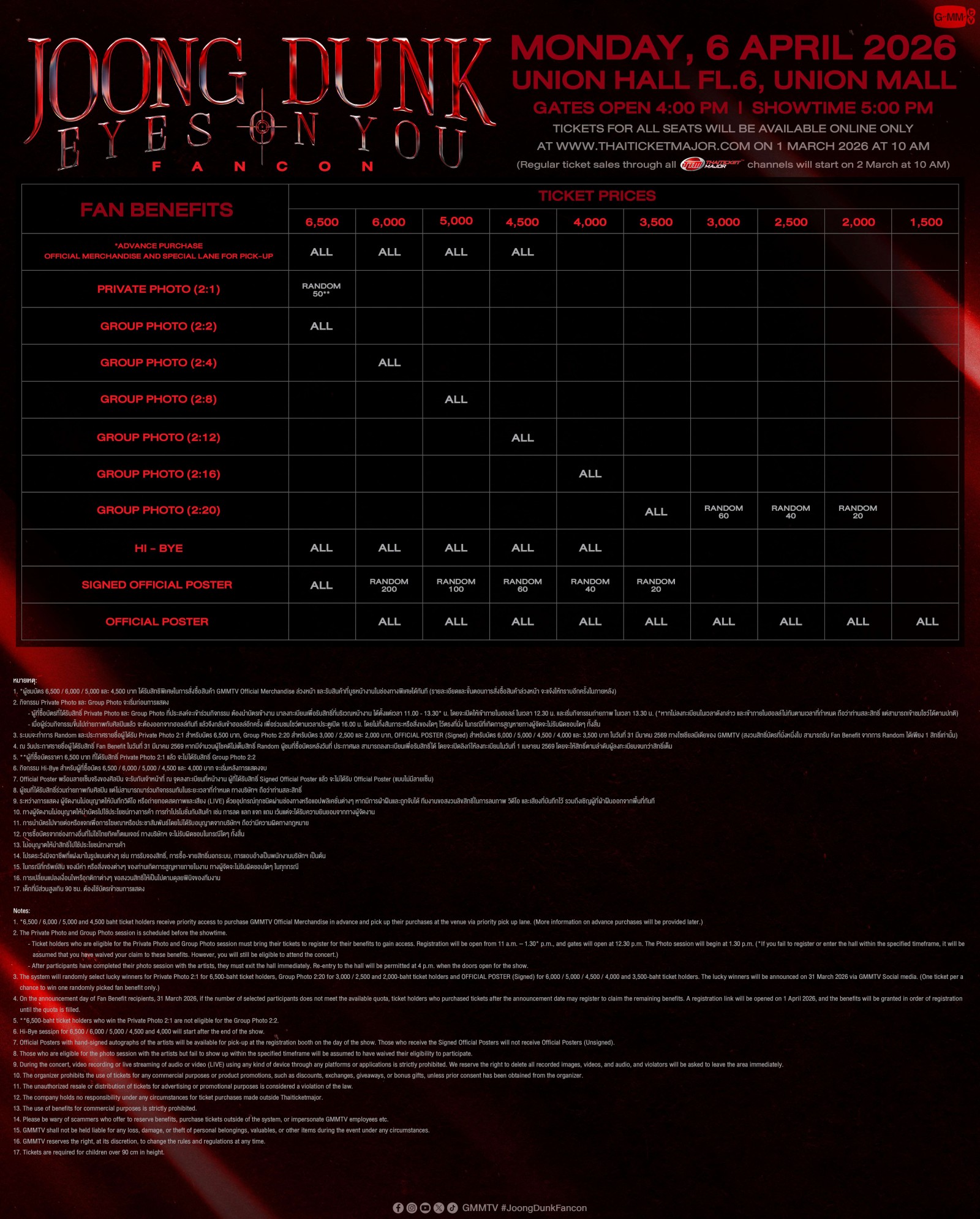 3.ระบบจะทำการ Random และประกาศรายชื่อผู้ได้รับ Private Photo 2:1 สำหรับบัตร 6,500 บาท, Group Photo 2:20 สำหรับบัตร 3,000 / 2,500 และ 2,000 บาท, OFFICIAL POSTER (Signed) สำหรับบัตร 6,000 / 5,000 / 4,500 / 4,000 และ 3,500 บาท ในวันที่ 31 มีนาคม 2569 ทางโซเชียลมีเดียของ GMMTV (สงวนสิทธิ์บัตรที่นั่งหนึ่งใบ สามารถรับ Fan Benefit จากการ Random ได้เพียง 1 สิทธิ์เท่านั้น)