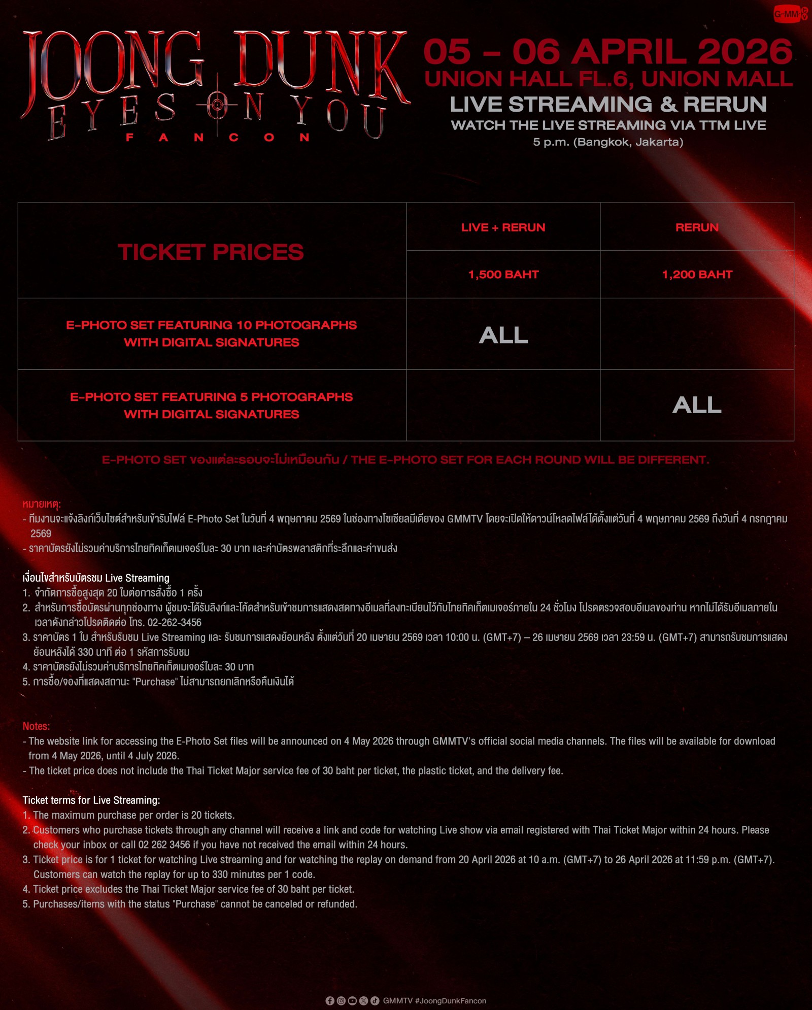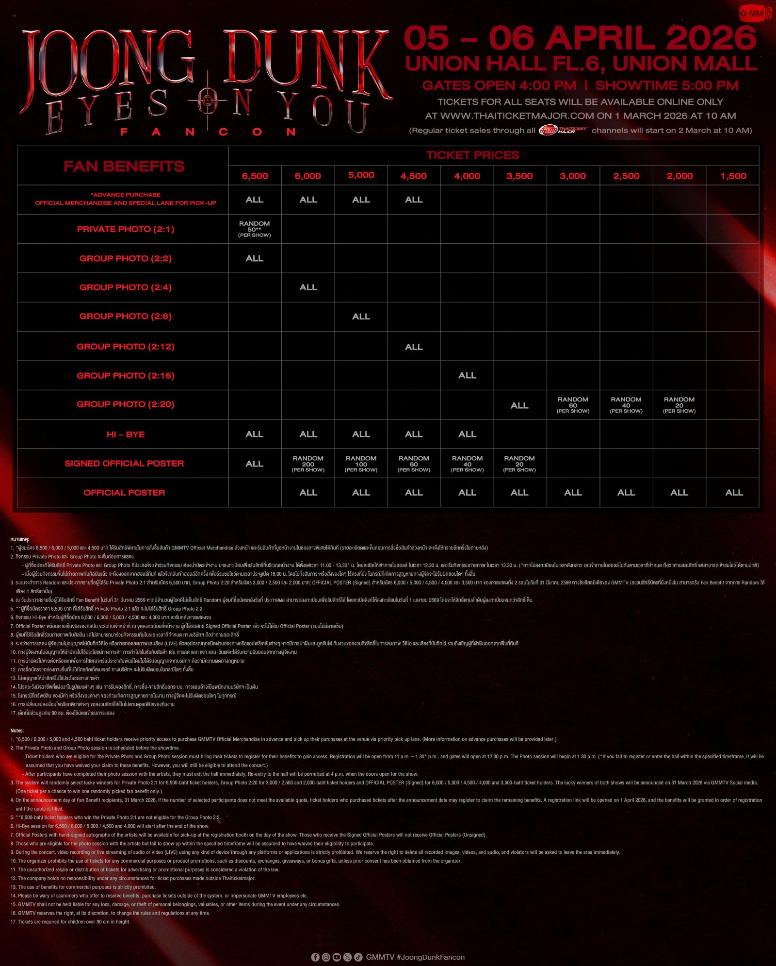 3.ระบบจะทำการ Random และประกาศรายชื่อผู้ได้รับ Private Photo 2:1 สำหรับบัตร 6,500 บาท, Group Photo 2:20 สำหรับบัตร 3,000 / 2,500 และ 2,000 บาท, OFFICIAL POSTER (Signed) สำหรับบัตร 6,000 / 5,000 / 4,500 / 4,000 และ 3,500 บาท ของทั้ง 2 รอบการแสดง ในวันที่ 31 มีนาคม 2569 ทางโซเชียลมีเดียของ GMMTV (สงวนสิทธิ์บัตรที่นั่งหนึ่งใบ สามารถรับ Fan Benefit จากการ Random ได้เพียง 1 สิทธิ์เท่านั้น)