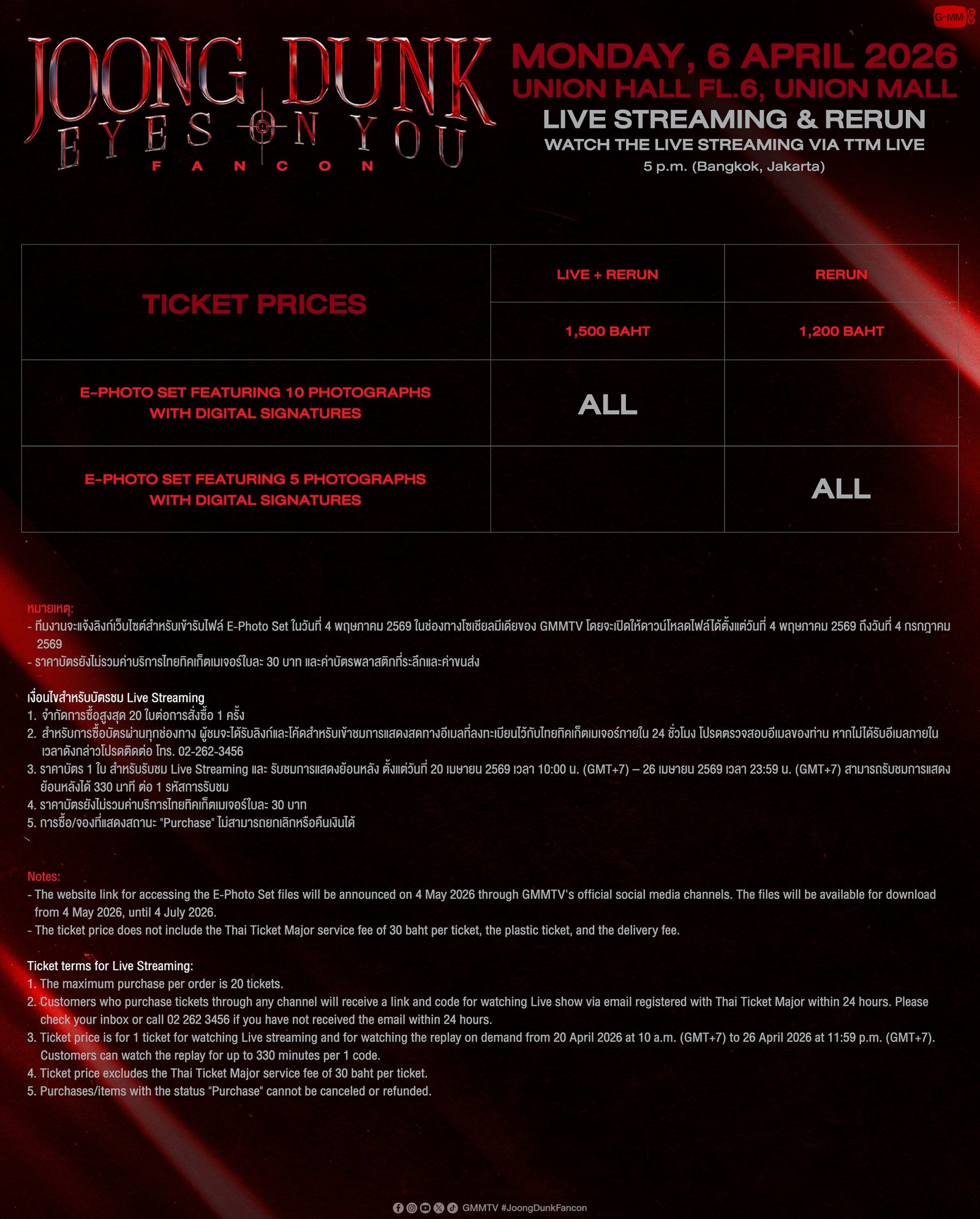 - ทีมงานจะแจ้งลิงก์เว็บไซต์สำหรับเข้ารับไฟล์ E-Photo Set ในวันที่ 4 พฤษภาคม 2569 ในช่องทางโซเชียลมีเดียของ GMMTV โดยจะเปิดให้ดาวน์โหลดไฟล์ได้ตั้งแต่วันที่ 4 พฤษภาคม 2569 ถึงวันที่ 4 กรกฎาคม 2569