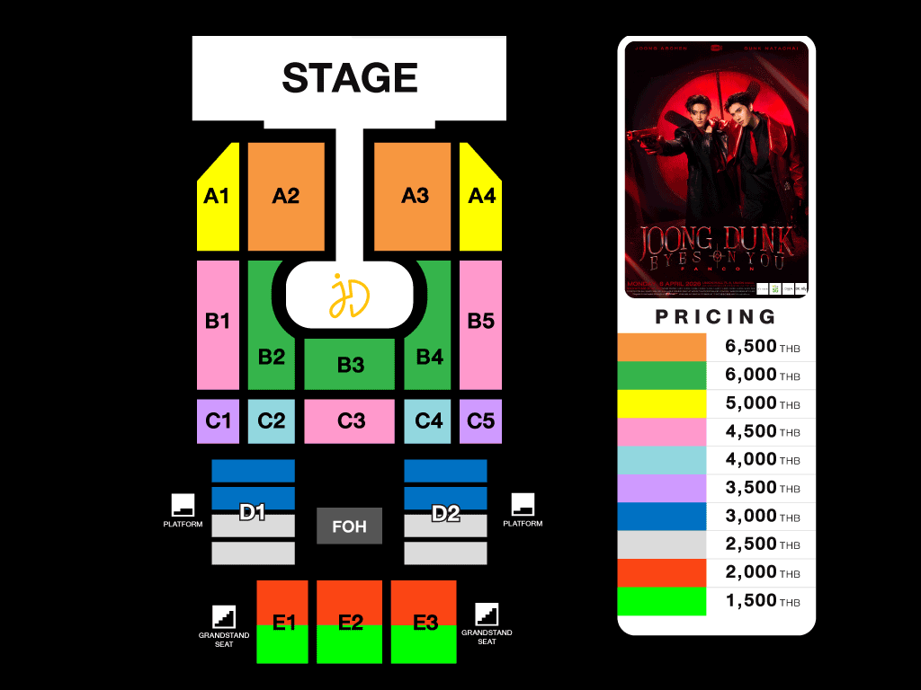 1. *ผู้ชมบัตร 6,500 / 6,000 / 5,000 และ 4,500 บาท ได้รับสิทธิพิเศษในการสั่งซื้อสินค้า GMMTV Official Merchandise ล่วงหน้า และรับสินค้าที่บูธหน้างานในช่องทางพิเศษได้ทันที (รายละเอียดและขั้นตอนการสั่งซื้อสินค้าล่วงหน้า จะแจ้งให้ทราบอีกครั้งในภายหลัง)