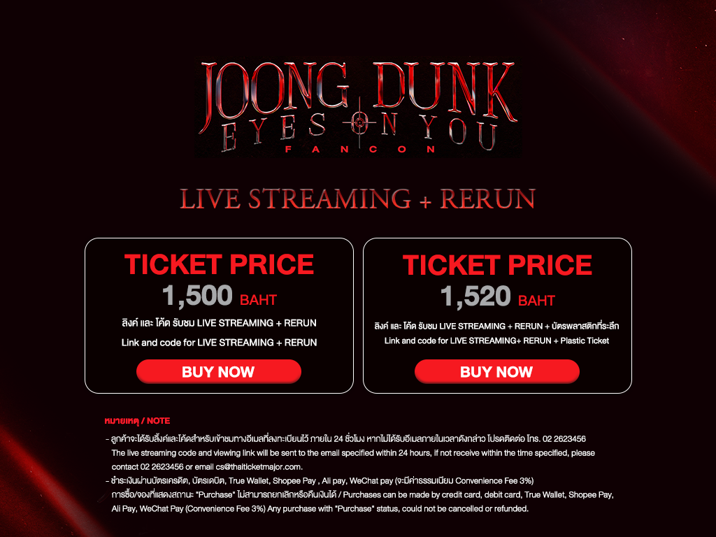 2. สำหรับการซื้อบัตรผ่านทุกช่องทาง ผู้ชมจะได้รับลิงก์และโค้ดสำหรับเข้าชมการแสดงสดทางอีเมลที่ลงทะเบียนไว้กับไทยทิคเก็ตเมเจอร์ภายใน 24 ชั่วโมง โปรดตรวจสอบอีเมลของท่าน หากไม่ได้รับอีเมลภายในเวลาดังกล่าวโปรดติดต่อ โทร. 02-262-3456
