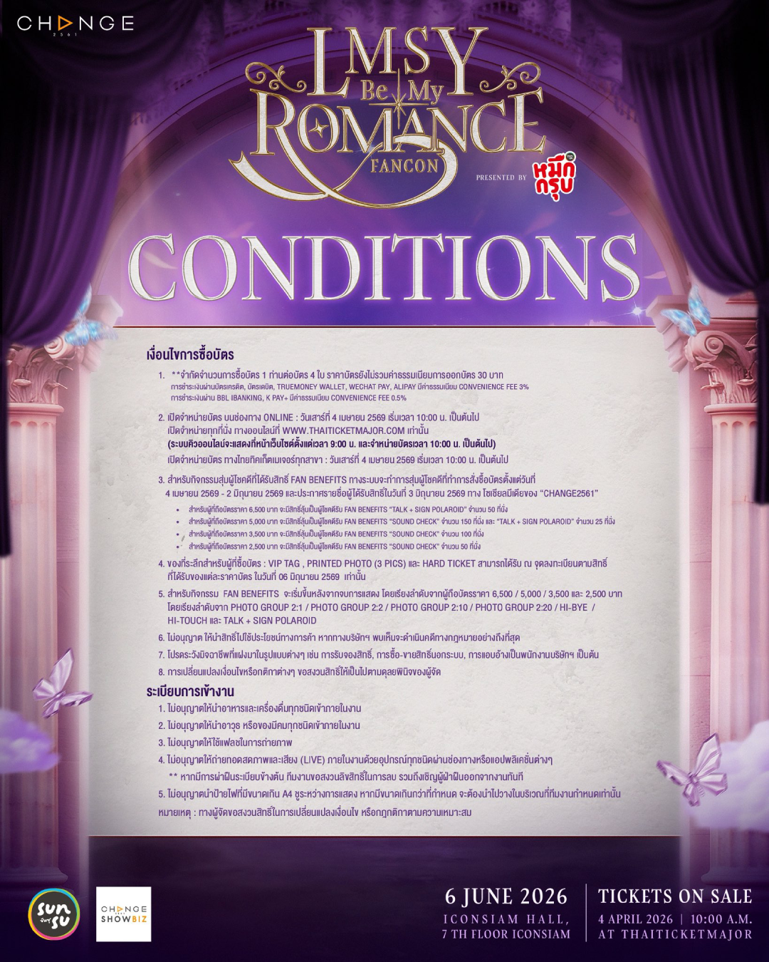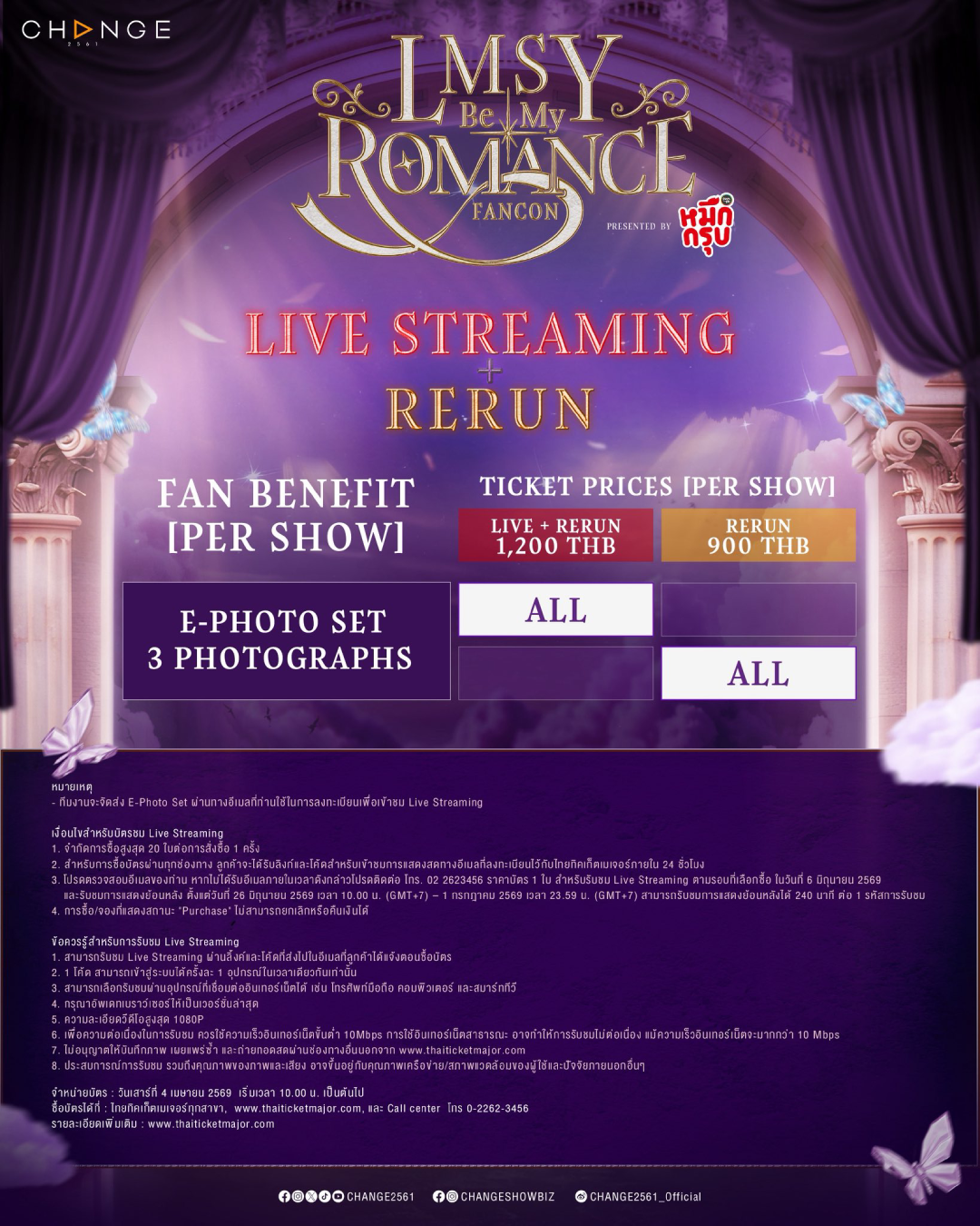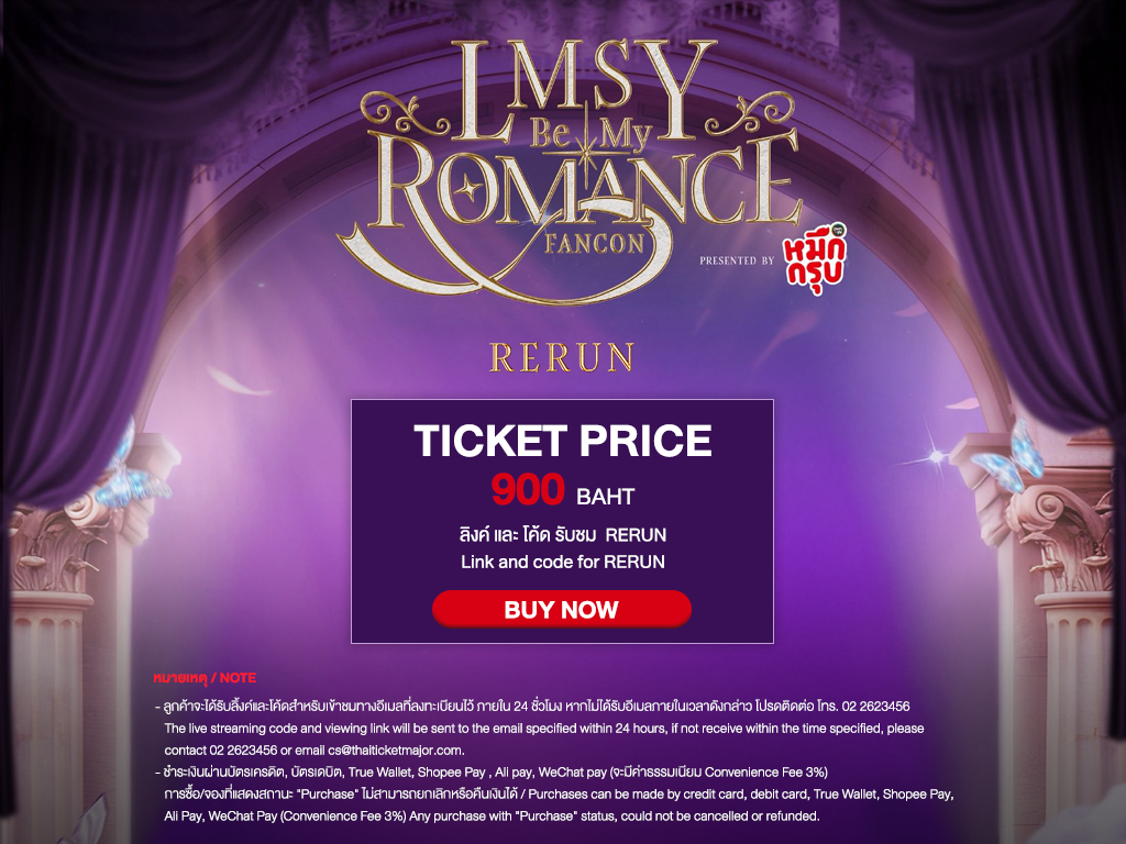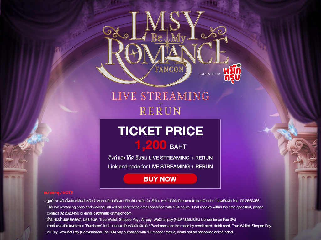 3. ราคาบัตร 1 ใบ สำหรับรับชม Live Streaming ตามรอบที่เลือกซื้อ ในวันที่ 6 มิถุนายน 2569 และ รับชมการแสดงย้อนหลัง ตั้งแต่วันที่ 26 มิถุนายน 2569 เวลา 10.00 น. (GMT+7) – วันที่ 1 กรกฎาคม 2569 เวลา 23.59 น. (GMT+7) สามารถรับชมการแสดงย้อนหลังได้ 240 นาที ต่อ 1 รหัสการรับชม