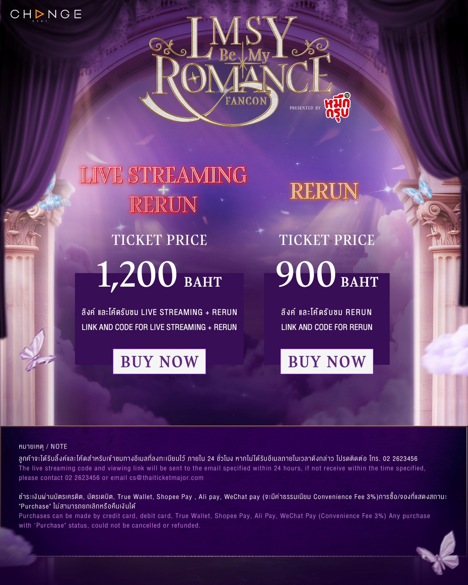 1,200 บาท (ลิ้งค์และโค้ดรับชม สำหรับ Live Streaming + Rerun) 900 บาท (ลิ้งค์และโค้ดรับชม สำหรับ Rerun) |