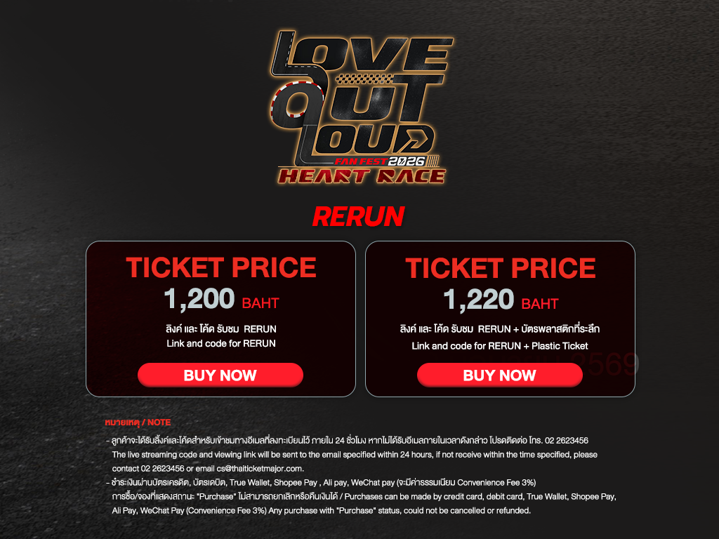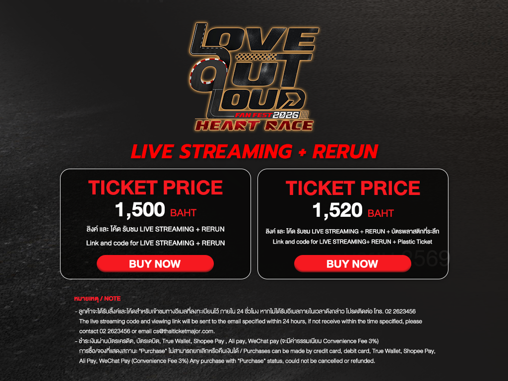3. ราคาบัตร 1 ใบ สำหรับรับชม Live Streaming และ รับชมการแสดงย้อนหลัง ตั้งแต่วันที่ 12 มิถุนายน 2569 เวลา 10:00 น. (GMT+7) – 18 มิถุนายน 2569 เวลา 23:59 น. (GMT+7) สามารถรับชมการแสดงย้อนหลังได้ 420 นาที ต่อ 1 รหัสการรับชม