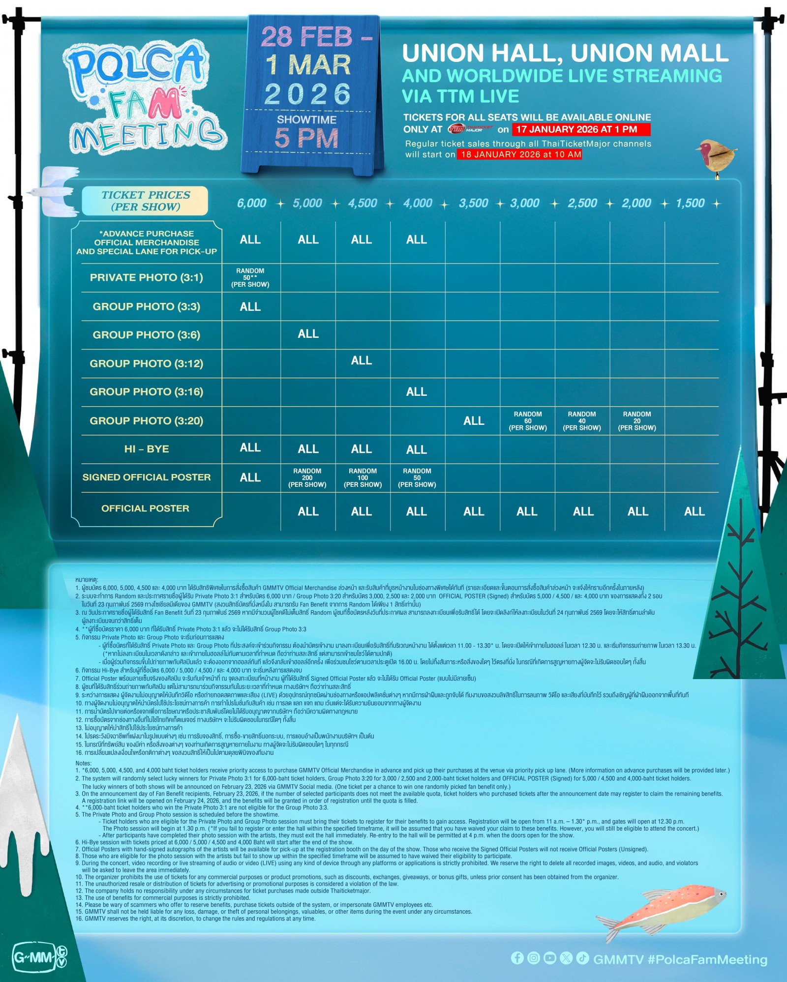 2. ระบบจะทำการ Random และประกาศรายชื่อผู้ได้รับ Private Photo 3:1 สำหรับบัตร 6,000 บาท / Group Photo 3:20 สำหรับบัตร 3,000, 2,500 และ 2,000 บาท OFFICIAL POSTER (Signed) สำหรับบัตร 5,000 / 4,500 / และ 4,000 บาท ของทั้ง 2 รอบการแสดง ในวันที่ 23 กุมภาพันธ์ 2569 ทางโซเชียลมีเดียของ GMMTV (สงวนสิทธิ์บัตรที่นั่งหนึ่งใบ สามารถรับ Fan Benefit จากการ Random ได้เพียง 1 สิทธิ์เท่านั้น)