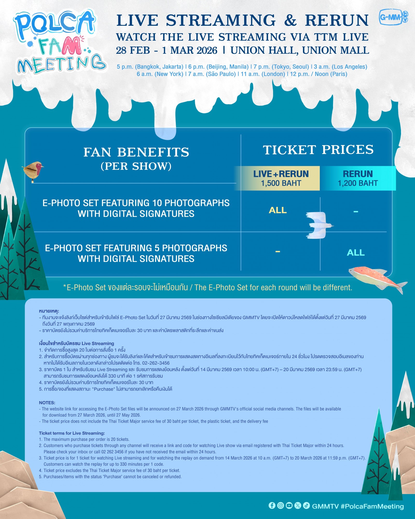 - ทีมงานจะแจ้งลิงก์เว็บไซต์สำหรับเข้ารับไฟล์ E-Photo Set ในวันที่ 27 มีนาคม 2569 ในช่องทางโซเชียลมีเดียของ GMMTV โดยจะเปิดให้ดาวน์โหลดไฟล์ได้ตั้งแต่วันที่ 27 มีนาคม 2569 ถึงวันที่ 27 พฤษภาคม 2569