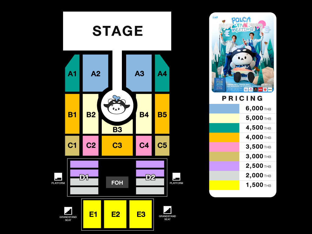 | บัตรราคา : | 6,000 / 5,000 /4,500 / 4,000 / 3,500 / 3,000 / 2,500 / 2,000 / 1,500 บาท |
