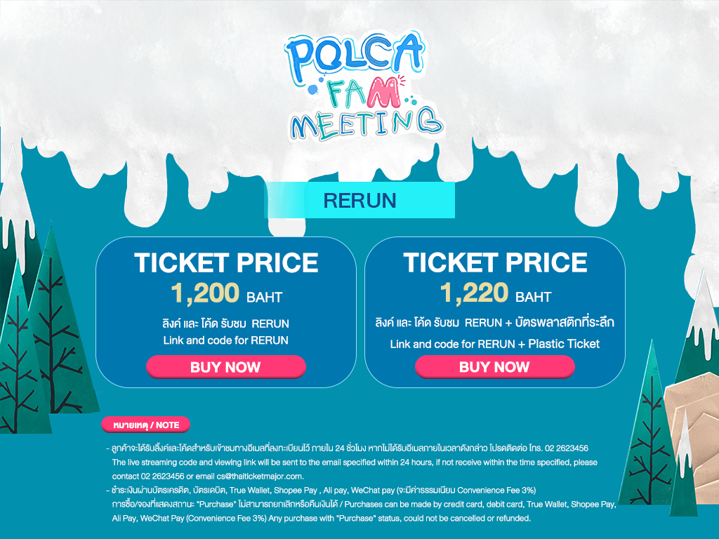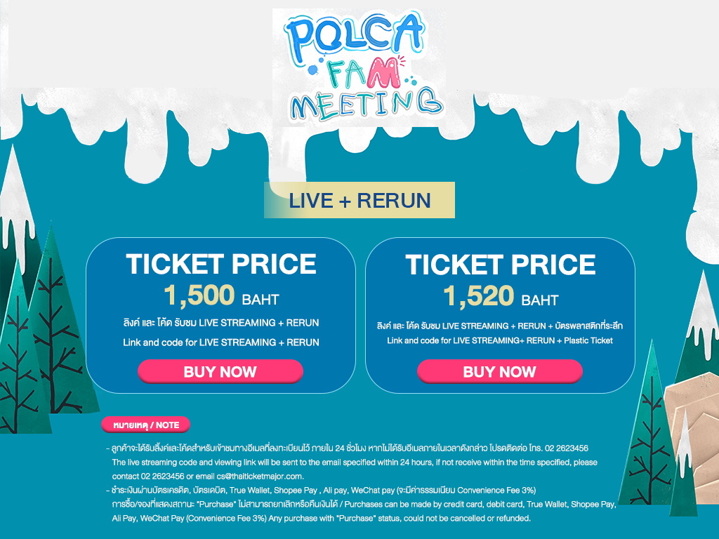 2. สำหรับการซื้อบัตรผ่านทุกช่องทาง ผู้ชมจะได้รับลิงก์และโค้ดสำหรับเข้าชมการแสดงสดทางอีเมลที่ลงทะเบียนไว้กับไทยทิคเก็ตเมเจอร์ภายใน 24 ชั่วโมง โปรดตรวจสอบอีเมลของท่าน หากไม่ได้รับอีเมลภายในเวลาดังกล่าวโปรดติดต่อ โทร. 02-262-3456