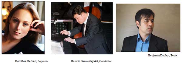 รายการเพลงในคอนเสิร์ตครั้งนี้ ขับร้องโดยศิลปินนักร้องรับเชิญ Dorothea Herbert (โซปราโน) ที่มีชื่อชาวเยอรมัน และ Benjamin Dooley (เทนเนอร์) ลูกครึ่งไทย-ออสเตรเลีย อำนวยเพลงโดย ดำริห์ บรรณวิทยกิจ ผู้อำนวยเพลงชาวไทยซึ่งเป็นที่รู้จักกันดีในวงการ