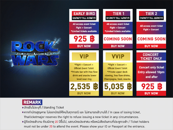 Rock Wars is a new and exciting fight and music entertainment collaboration bringing you the most exciting Thai and international fighters from the best fight camps together with the biggest bands Big Ass, Paradox and Klear with DJ Herobust for the first event in Thailand.