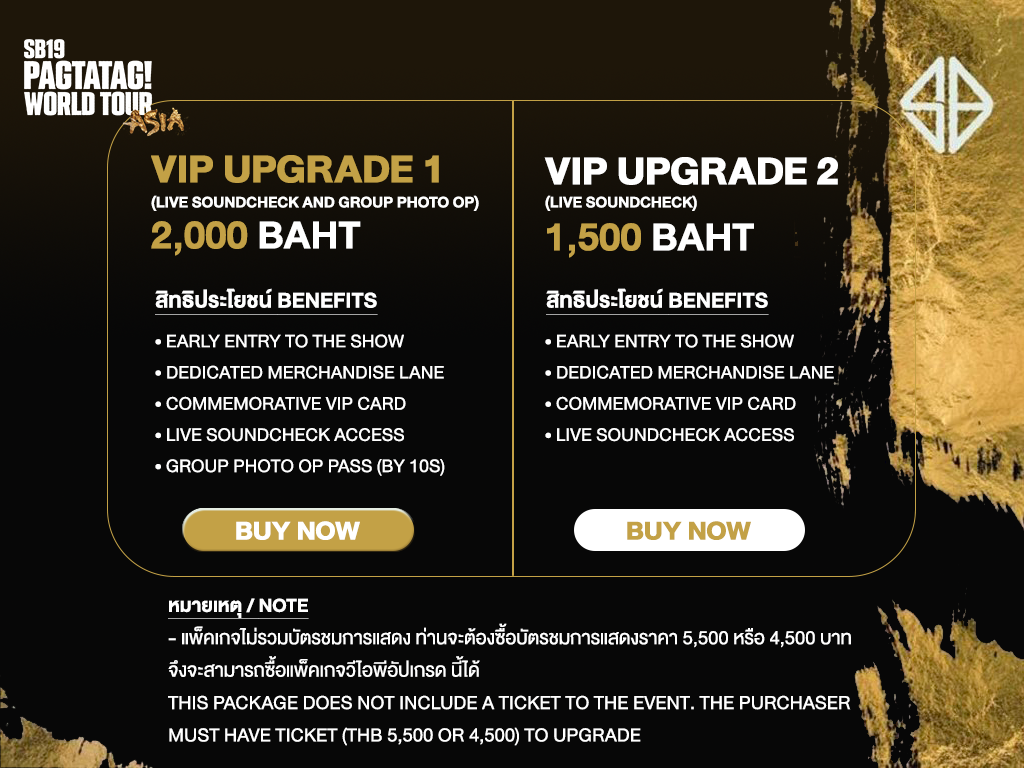หมายเหตุ: การอัพเกรด VIP 1 และการอัพเกรด VIP 2 สามารถซื้อได้ทางออนไลน์หลังจากที่คุณซื้อบัตรรับชมระดับ 1 หรือ 2 แล้วเท่านั้น