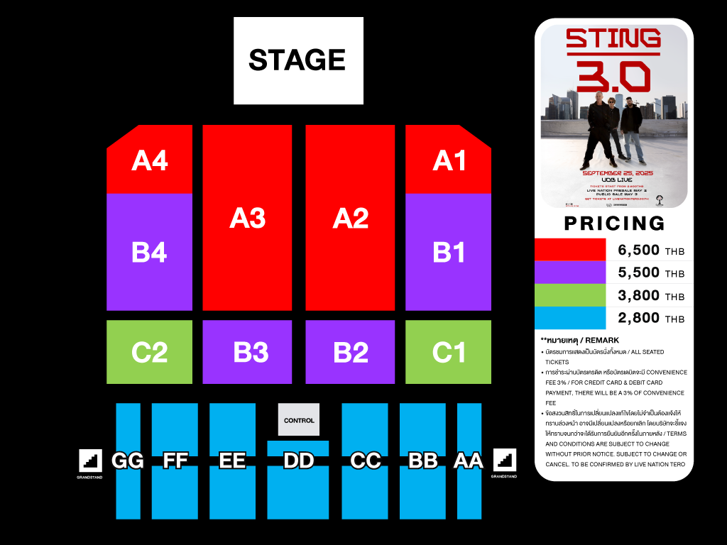 5. บัตรของคุณถูกขายโดยผู้จัดฯ โดยตรงให้กับผู้ชม บัตรใดๆ ที่ซื้อจากหน่วยงานธุรกิจหรือผู้ค้าที่ละเมิดข้อกำหนดและเงื่อนไขการขายบัตรจะถูกยกเลิก การซื้อบัตรถือเป็นการยอมรับข้อกำหนดและเงื่อนไขเหล่านี้อันเป็นการยืนยันว่าคุณเป็นผู้ชม