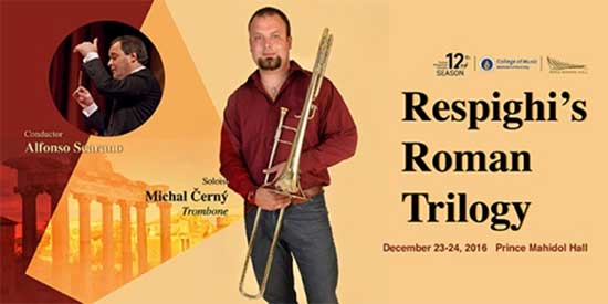 คอนเสิร์ตในค่ำคืนนี้ขอนำโอกาสทีหาชมได้ยากยิ่งด้วยผลงานของนักประพันธ์เพลงชาวอิตาเลียน Ottorino Respighi เจ้าของผลงานที่เปี่ยมไปด้วยความฮึกเหิม ความเป็นอัจฉริยะทางการประพันธ์ของบทกลอนไตรภาคโรมัน ระบายด้วยเฉดสีอันสะดุดตาและละเลงภาพด้วยน้ำพุยุคเรเนซองส์ของเมือง กลุ่มต้นสนที่สวยงาม และเทศกาลประจำปีอันรื่นเริง ขณะเดียวกันก็มีความขัดแย้งสวยงามระหว่างกรุงโรมสมัยใหม่และความเป็นอดีตจักรวรรดิที่ยิ่งใหญ่