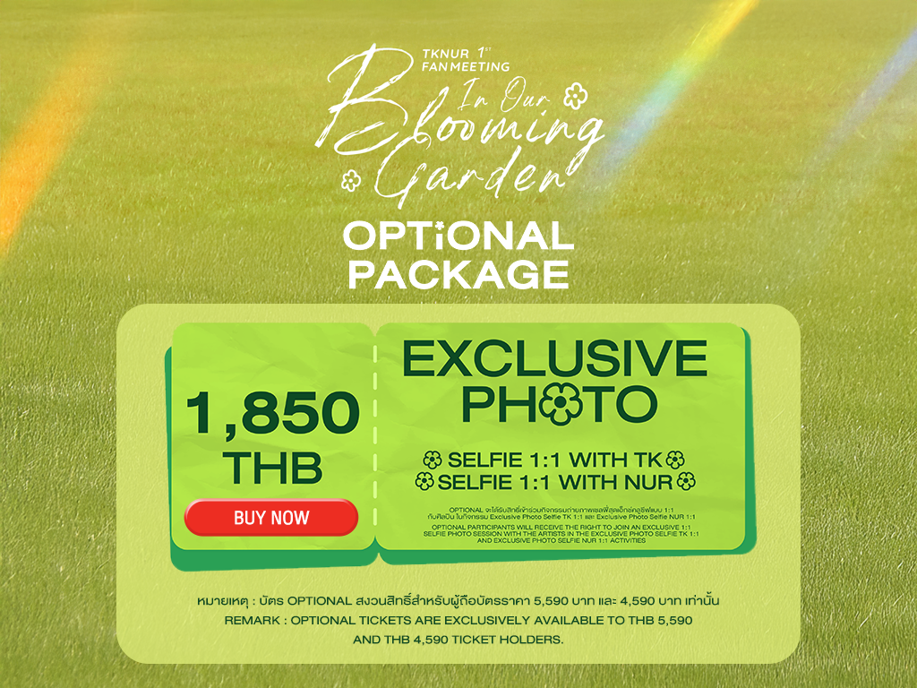 2. บัตร Optional ราคา 1,850 บาท รับสิทธิ์เข้าร่วมกิจกรรมถ่ายภาพเซลฟี่สุดเอ็กซ์คลูซีฟแบบ 1:1 กับศิลปิน ในกิจกรรม Exclusive Photo Selfie TK 1:1 และ Exclusive Photo Selfie NUR 1:1