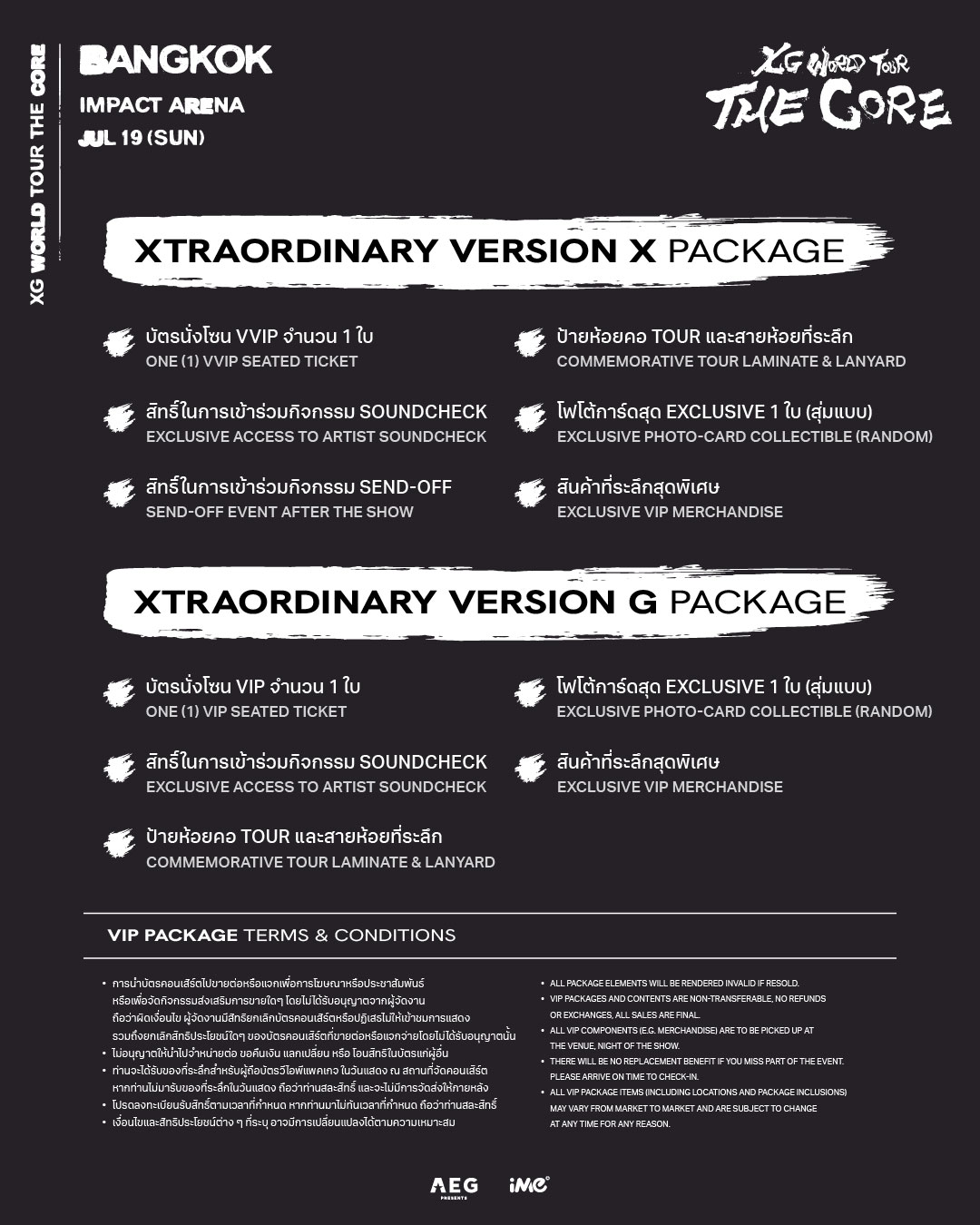สำหรับเหล่าหมาป่าที่เตรียมร่วมสัมผัสประสบการณ์ระดับโลก เตรียมตัวให้พร้อม! บัตรเข้าชมงาน XG WORLD TOUR: THE CORE IN BANGKOK ราคาเริ่มต้นที่ 2,500 บาท โดยแฟนคลับตัวจริงสามารถคว้าสิทธิ์จับจองที่นั่งก่อนใครในรอบ (Paid) ALPHAZ ANNUAL PREMIUM/STANDARD・MONTHLY PAID MEMBERS PRESALE ในวันพุธที่ 6 พฤษภาคม 2569 เวลา 10.00 – 23.59 น. และเปิดขายบัตรรอบ (Paid and Non-paid) ALL ALPHAZ MEMBERS (INCLUDING FREE MEMBERS) PRESALE ในวันพฤหัสบดีที่ 7 พฤษภาคม 2569 เวลา 10.00 – 23.59 น. ผ่านทาง www.thaiticketmajor.com (ดูรายละเอียดเพิ่มเติมเกี่ยวกับรอบ ALPHAZ Pre-Sale ได้ที่ http://xgalx.com/) สำหรับรอบจำหน่ายบัตรทั่วไป จะเริ่มเปิดขายในวันศุกร์ที่ 8 พฤษภาคม 2569 เวลา 10.00 น. เป็นต้นไป ผ่านทาง www.thaiticketmajor.com หรือ เคาน์เตอร์ไทยทิกเก็ตเมเจอร์ทุกสาขา Call Center 02-262-3456