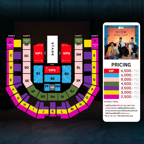 บัตรราคา VIP 6,500 / 6,000 / 5,000 / 4,500 / 3,500 / 3,000 / 2,500 บาท